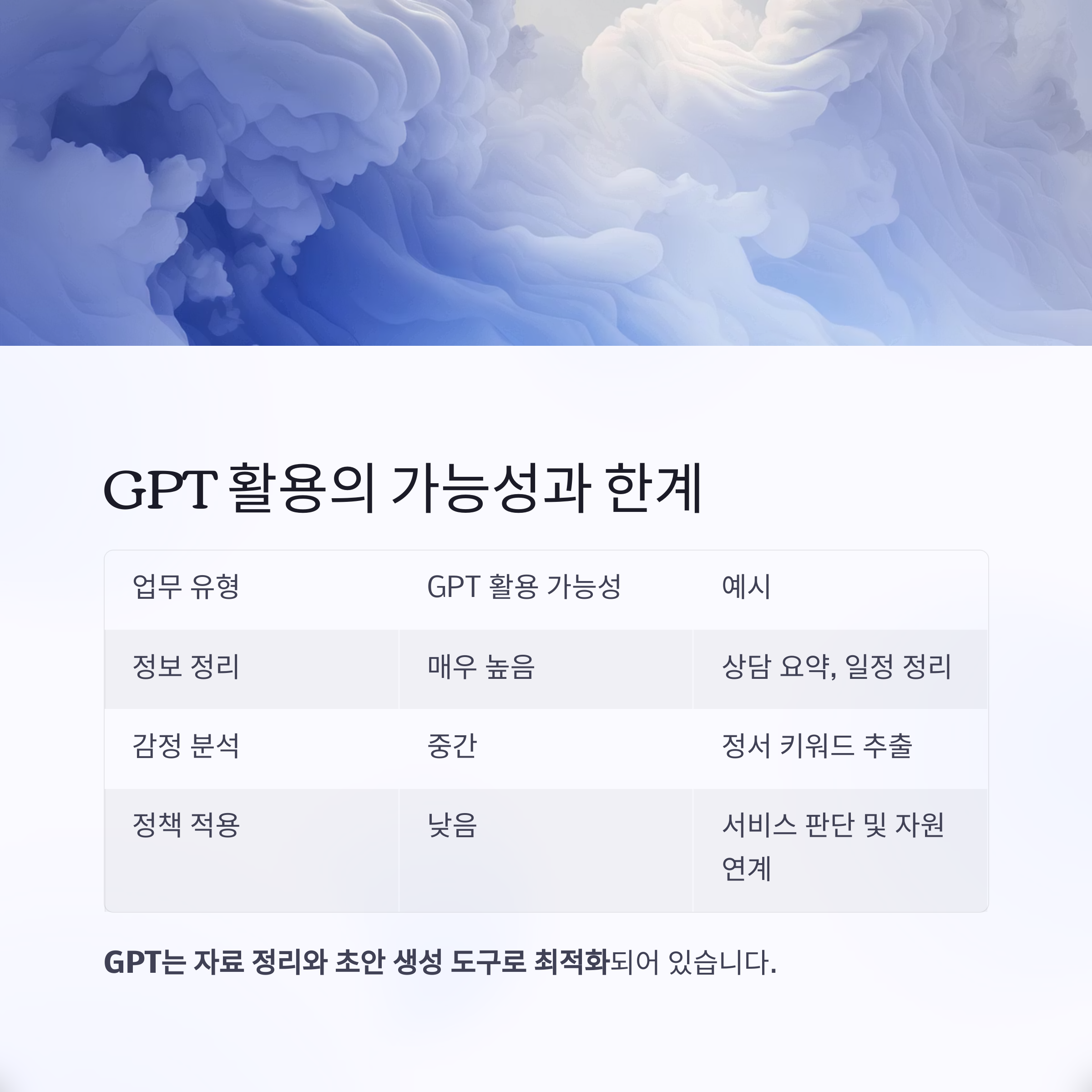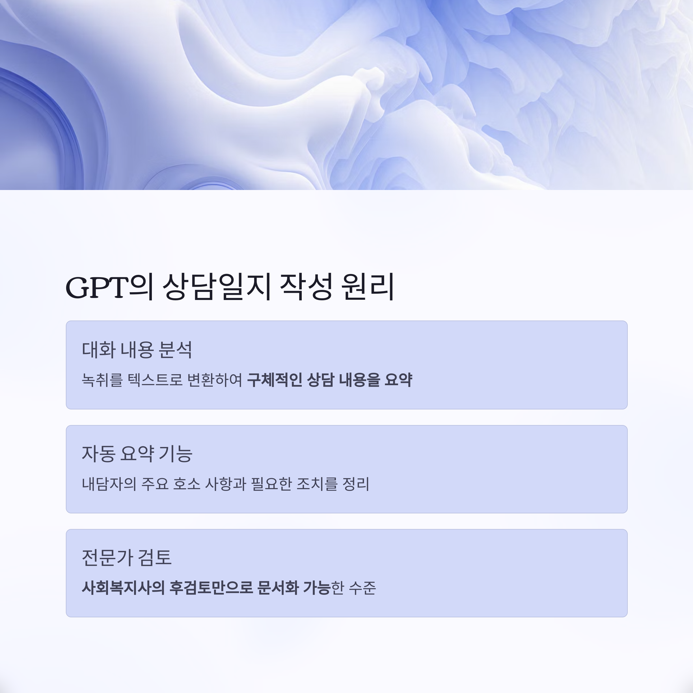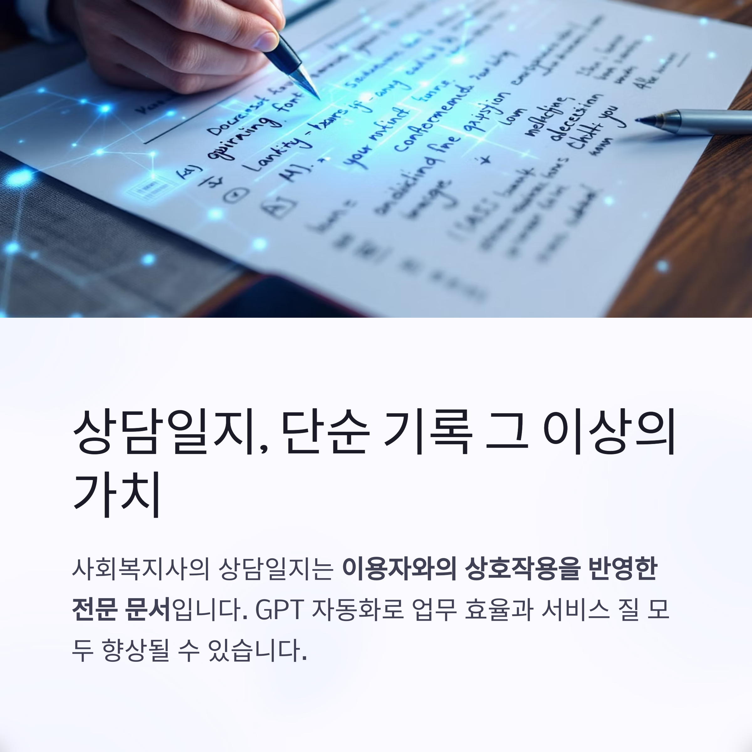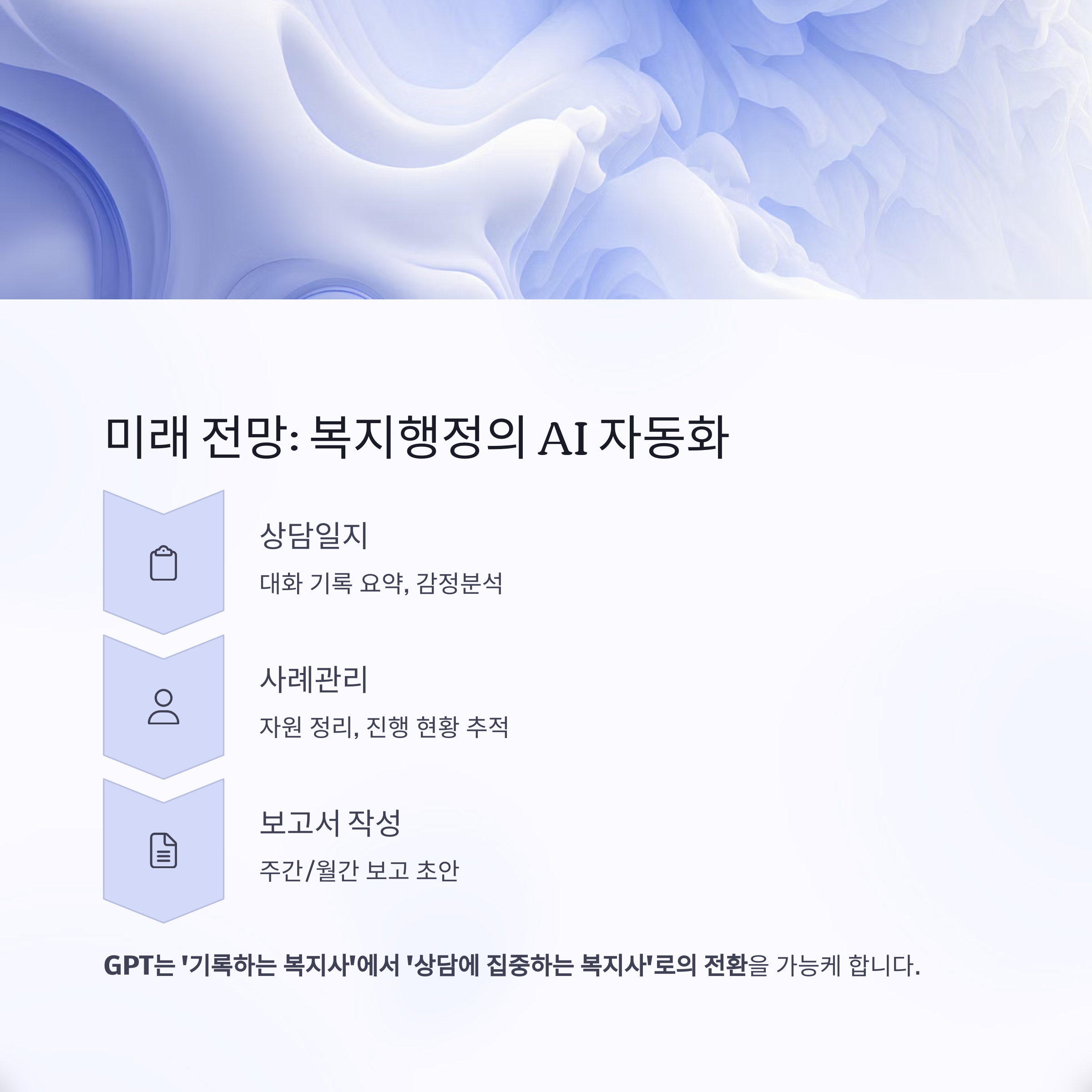GPT는 '기록하는 복지사'에서 '상담에 집중하는 복지사'로의 전환을 가능케 하는 기술입니다