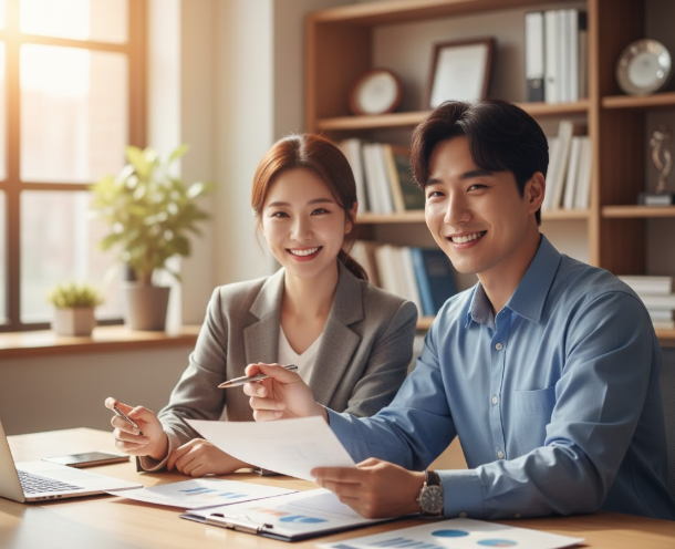 [이미지 3: 월급 계산기를 두드리며 미소 짓는 남녀 사회복지사]