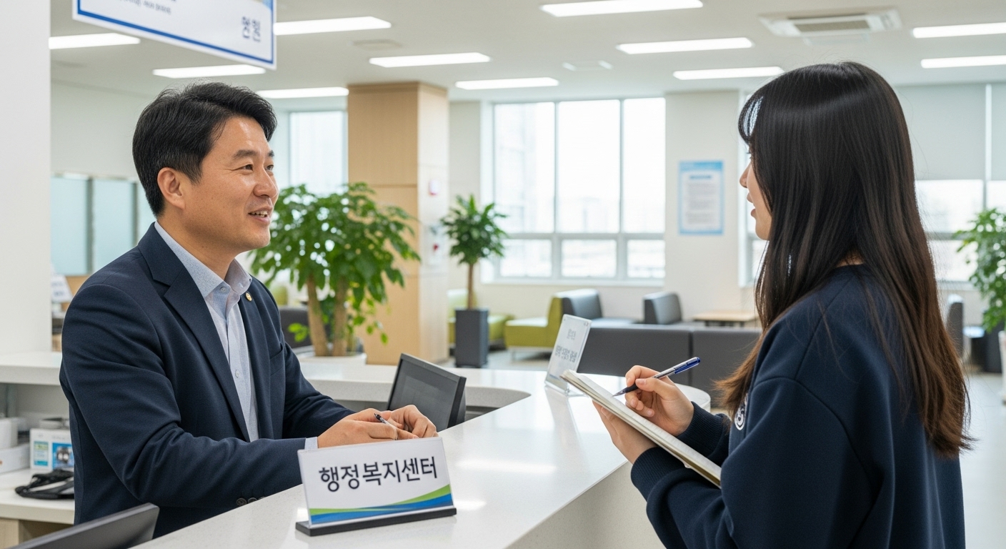 행정 복지센터에서 상담하는 친절한 공무원과 사회복지사 지망생