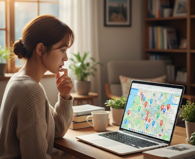 노트북 앞에 앉아 지도를 보며 고민하는 예비 사회복지사의 모습