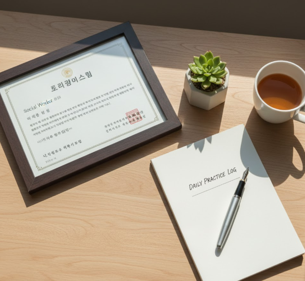 사회복지사 자격증과 실습 일지가 놓여 있는 책상 풍경