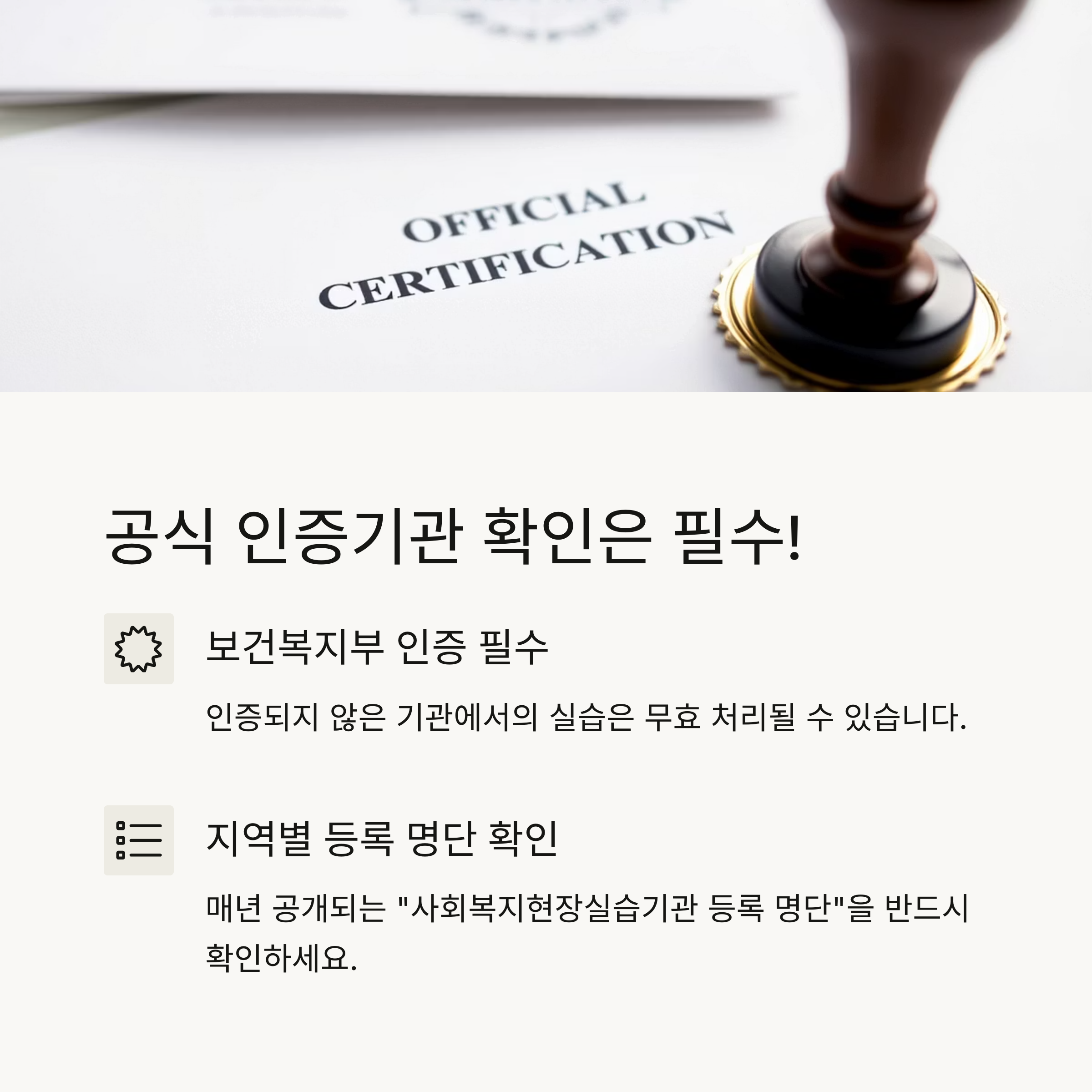 지역별로 매년 공개되는 "사회복지현장실습기관 등록 명단"을 반드시 확인하세요.