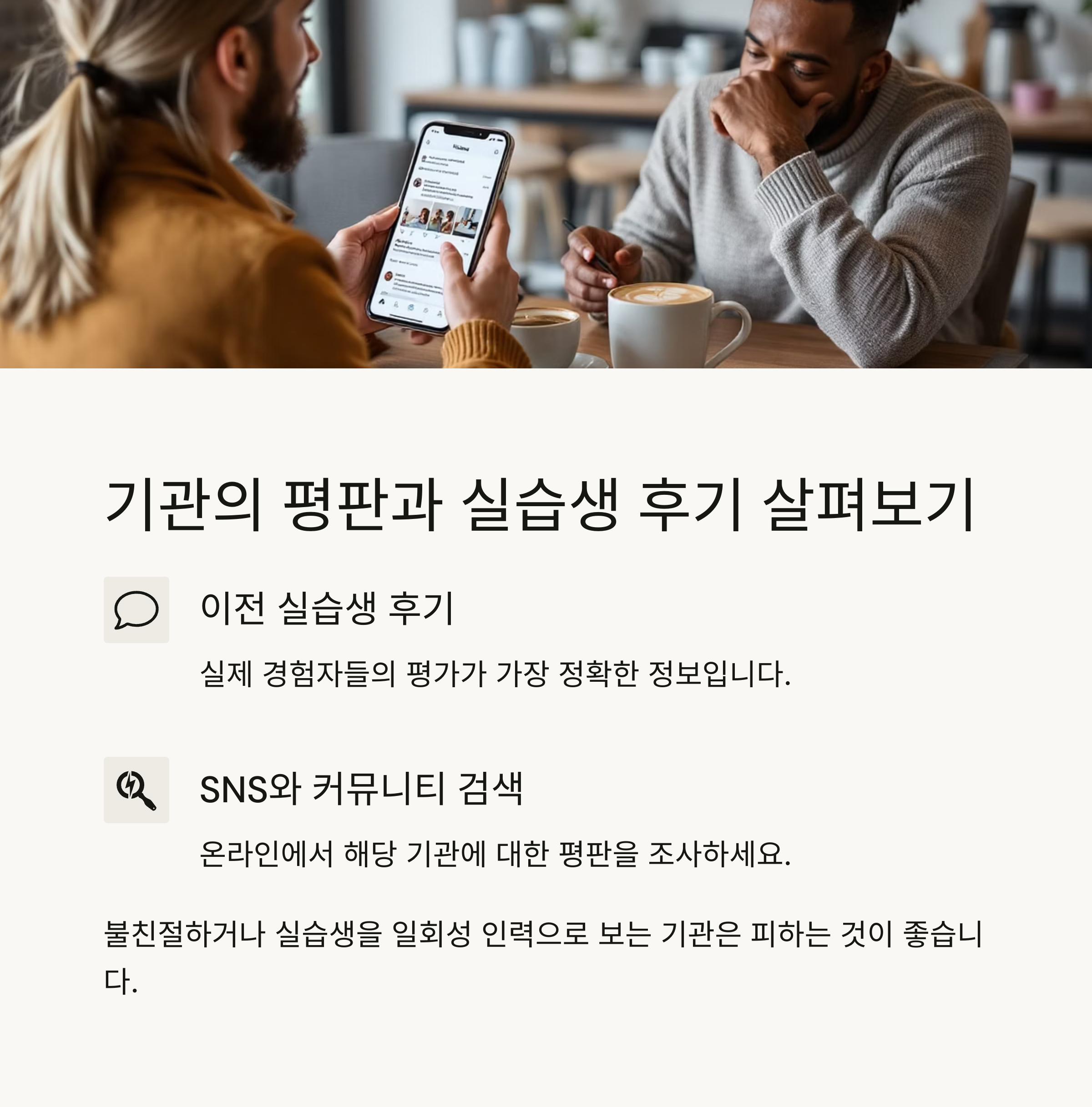"불친절하다", "실습생을 일회성 인력으로 본다"는 평이 많다면 해당 기관은 피하는 것이 좋습니다.