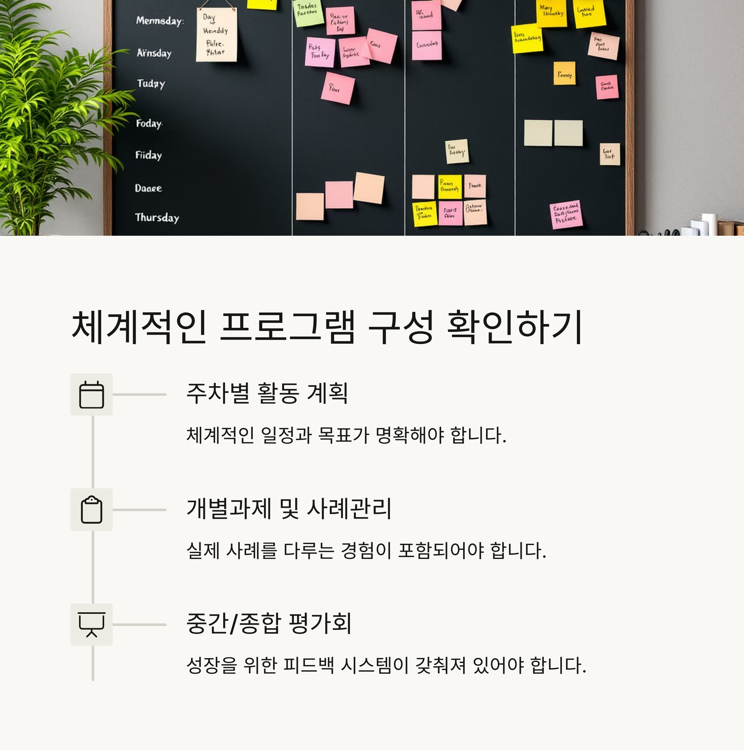 사전 OT, 주간 목표, 케이스 스터디, 평가 회의 등이 체계적으로 구성되어 있는지를 확인하세요.