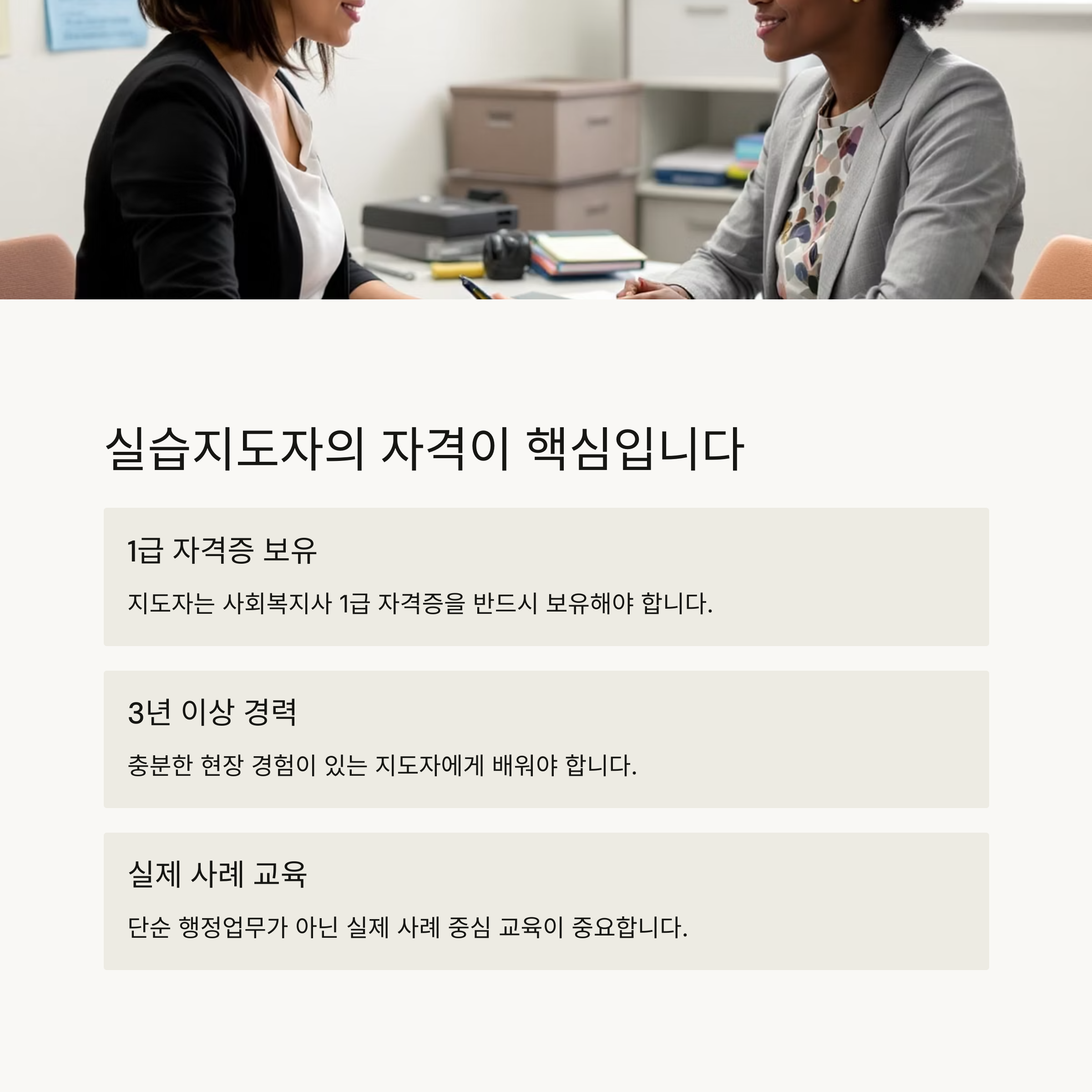 "실습의 질은 지도자에게 달려 있다"는 말이 있을 정도로, 실습지도자의 전문성은 매우 중요합니다.