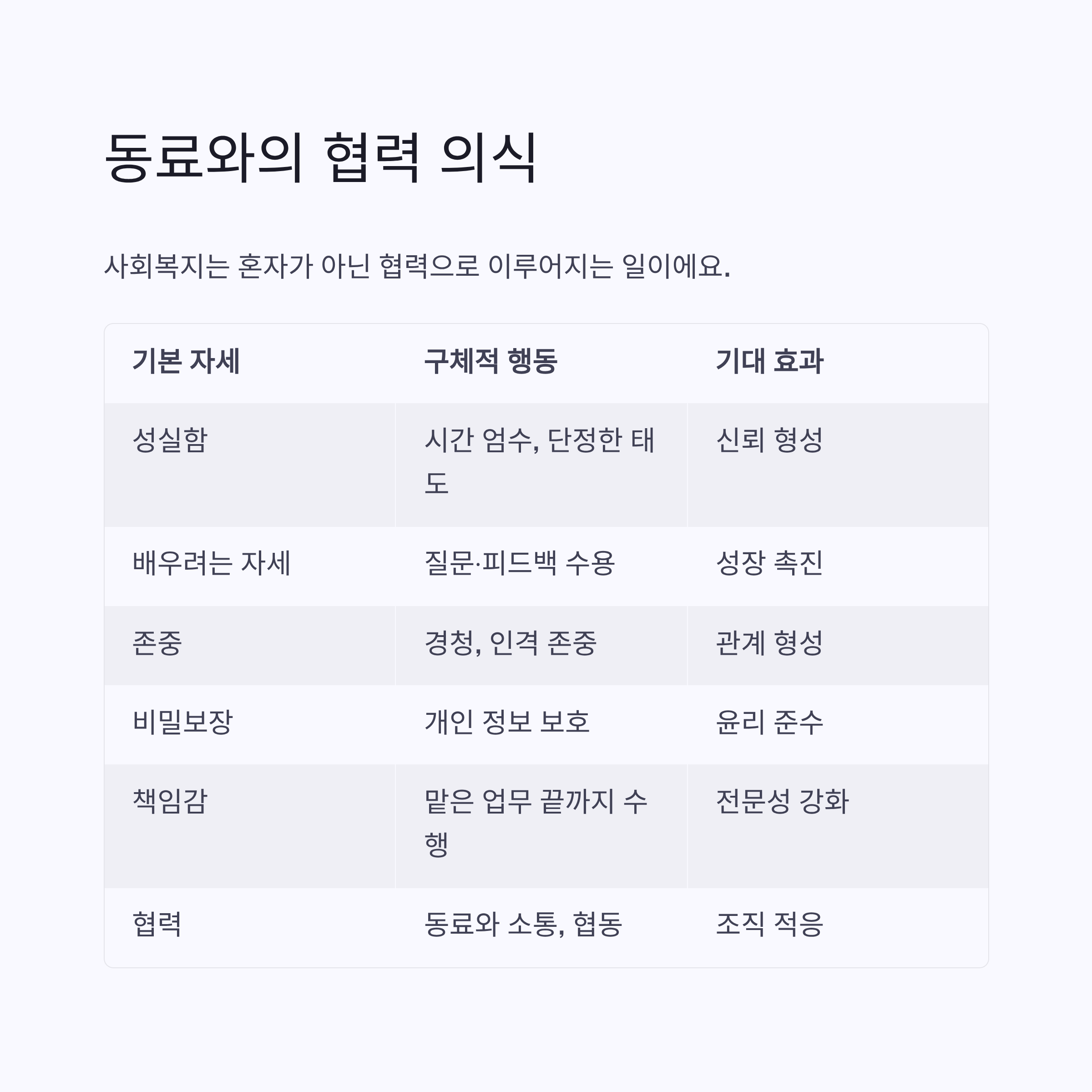 사회복지는 혼자 하는 일이 아니라 협력으로 이루어지는 일이에요. 실습생도 기관의 일원으로서 동료들과 원활하게 소통하고 협력해야 해요. 협동심을 발휘하면 현장 분위기에 자연스럽게 녹아들 수 있죠.