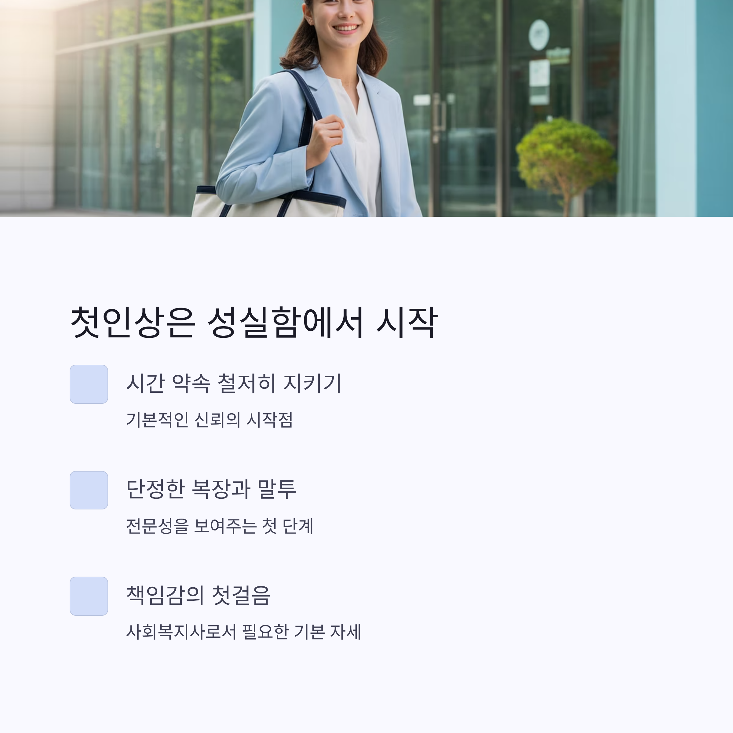 현장에 들어서면 가장 먼저 보이는 건 성실한 태도예요. 시간 약속을 철저히 지키고, 복장과 말투에서 신뢰를 주는 것이 기본이죠. 이는 단순히 예의 차원을 넘어, 사회복지사로서 필요한 책임감의 첫걸음이에요.