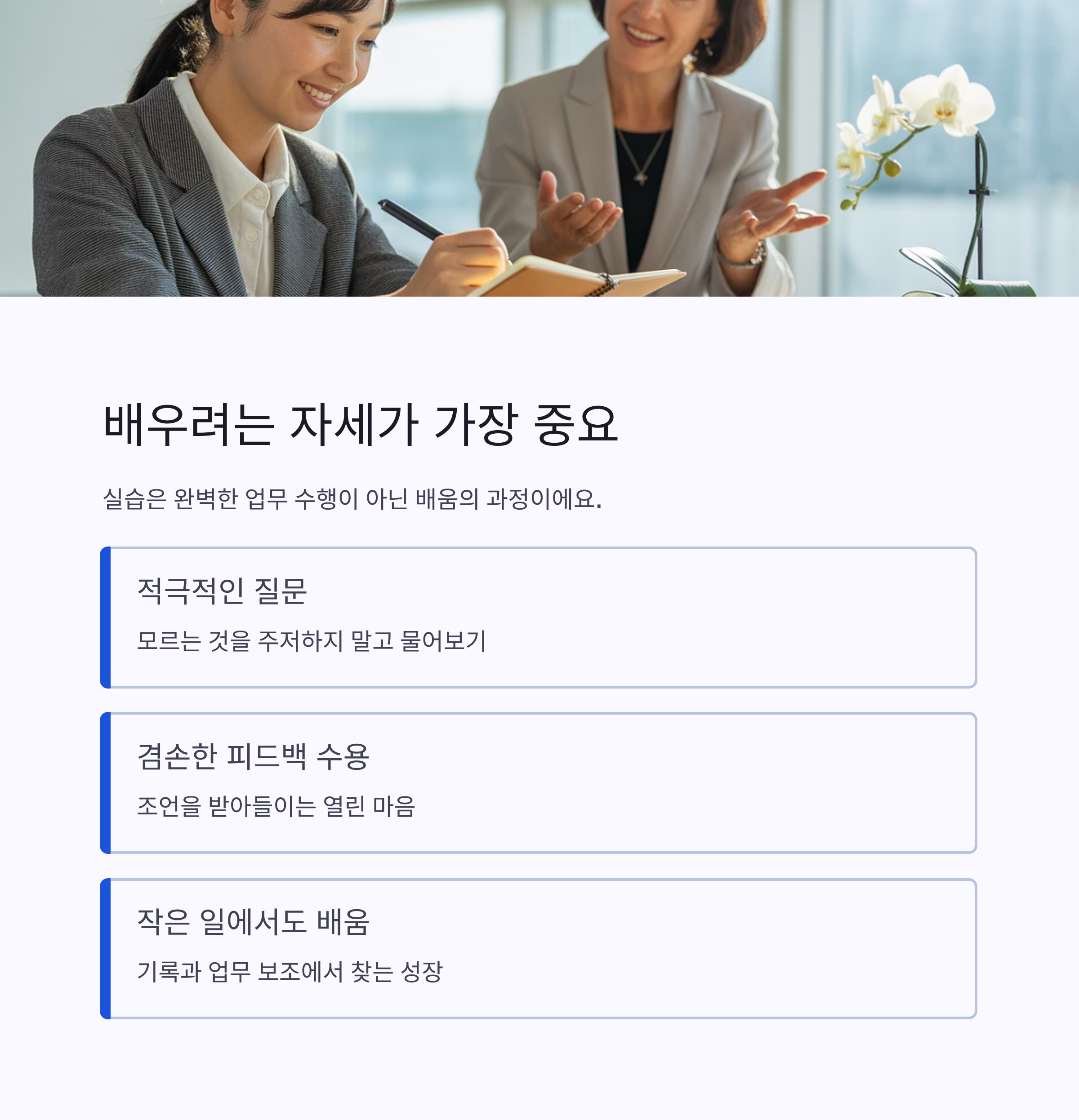 | 배우려는 자세 | 질문·피드백 수용 | 성장 촉진 |