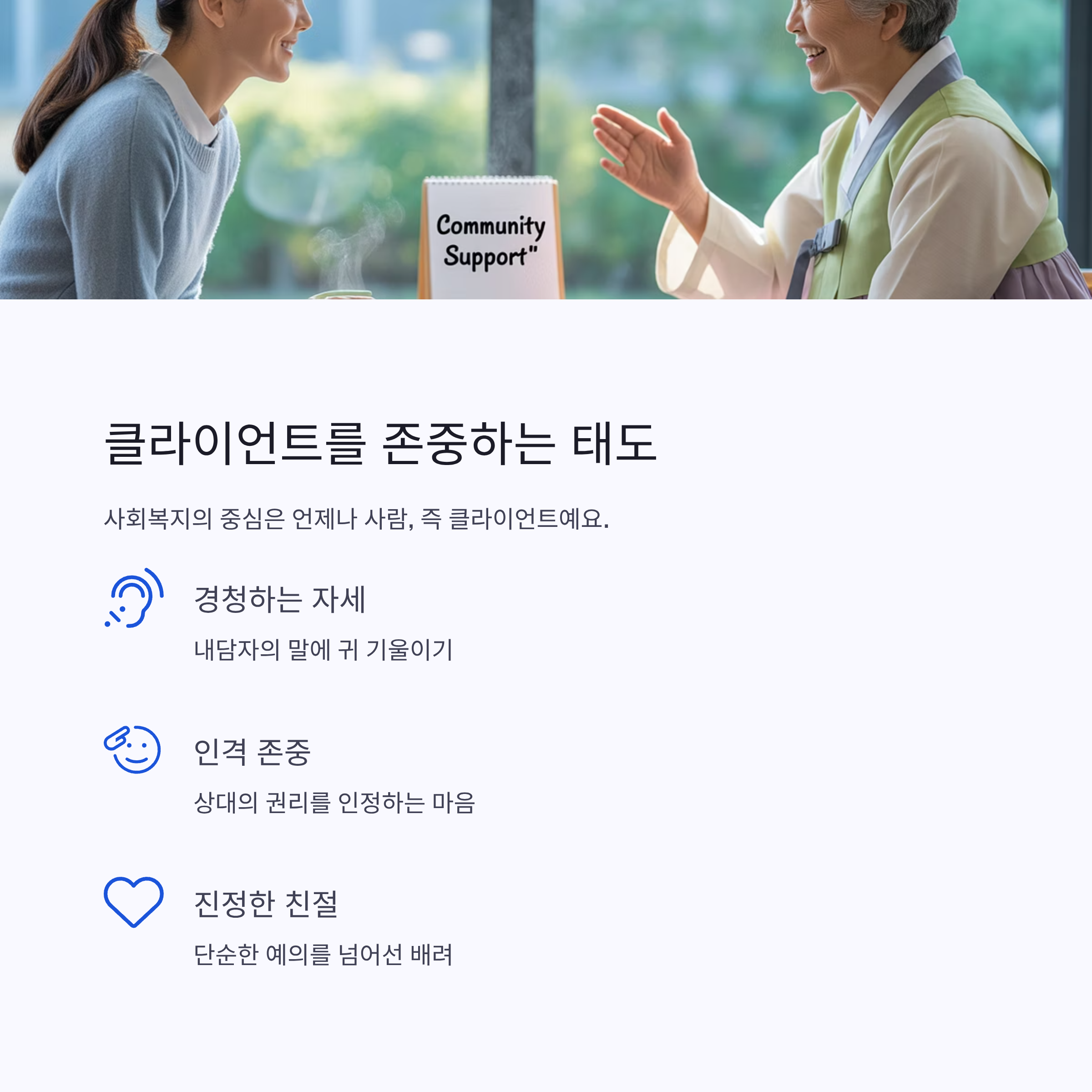 | 존중 | 경청, 인격 존중 | 관계 형성 |