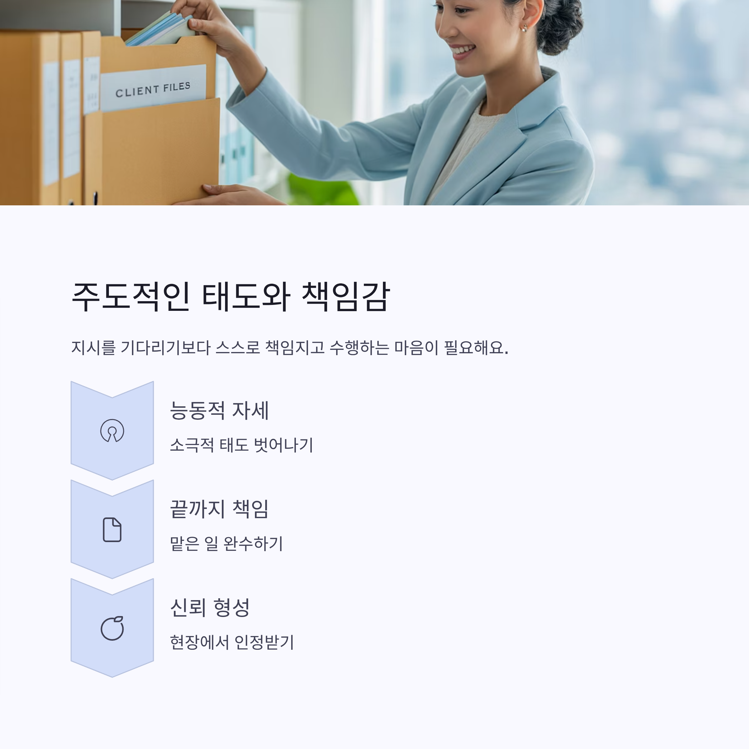 단순히 지시를 기다리는 소극적인 태도보다는, 맡은 일을 스스로 책임지고 주도적으로 수행하려는 마음이 필요해요. 작은 행정 업무라도 끝까지 책임지는 모습이 결국 현장에서 신뢰로 이어져요.