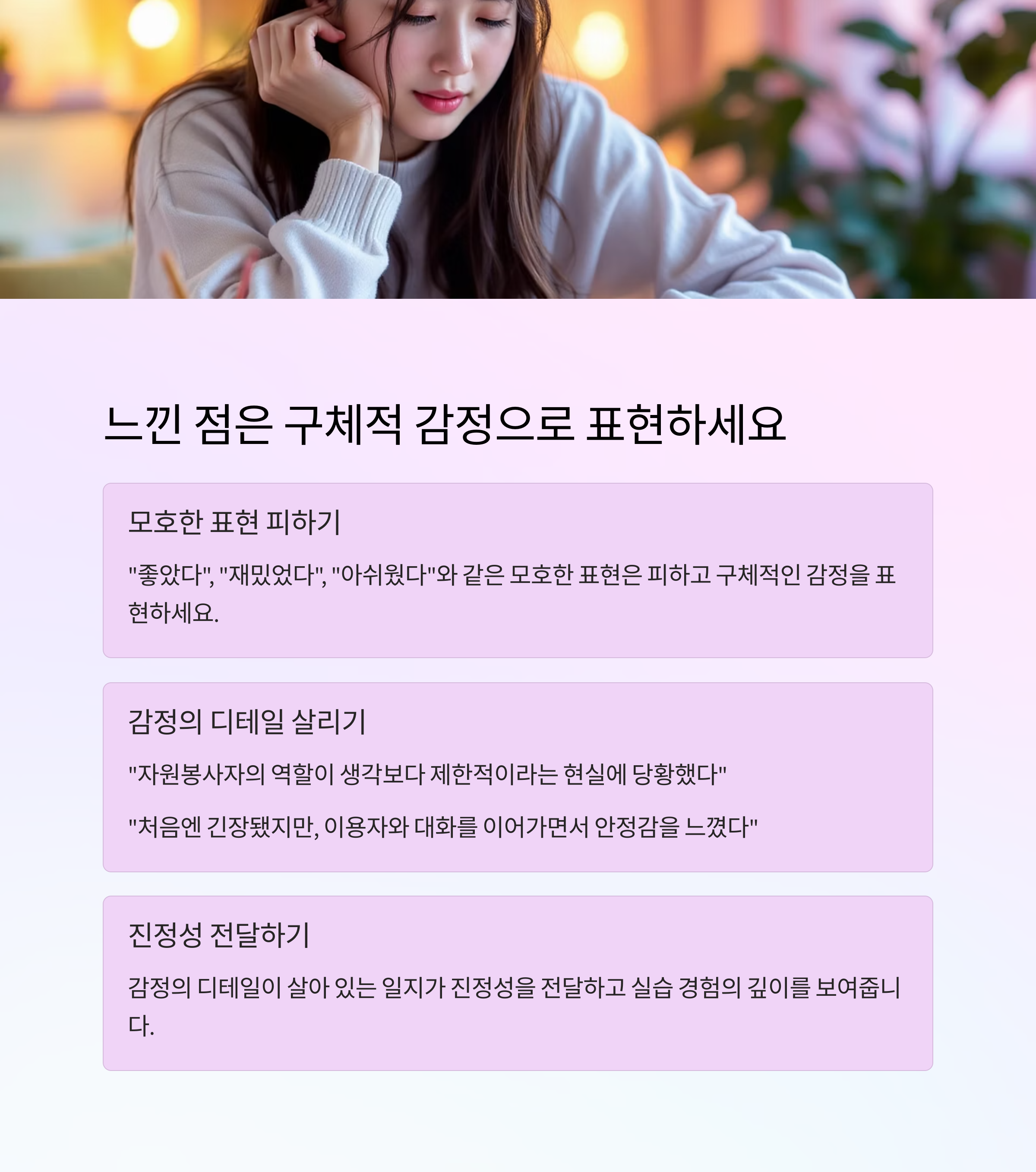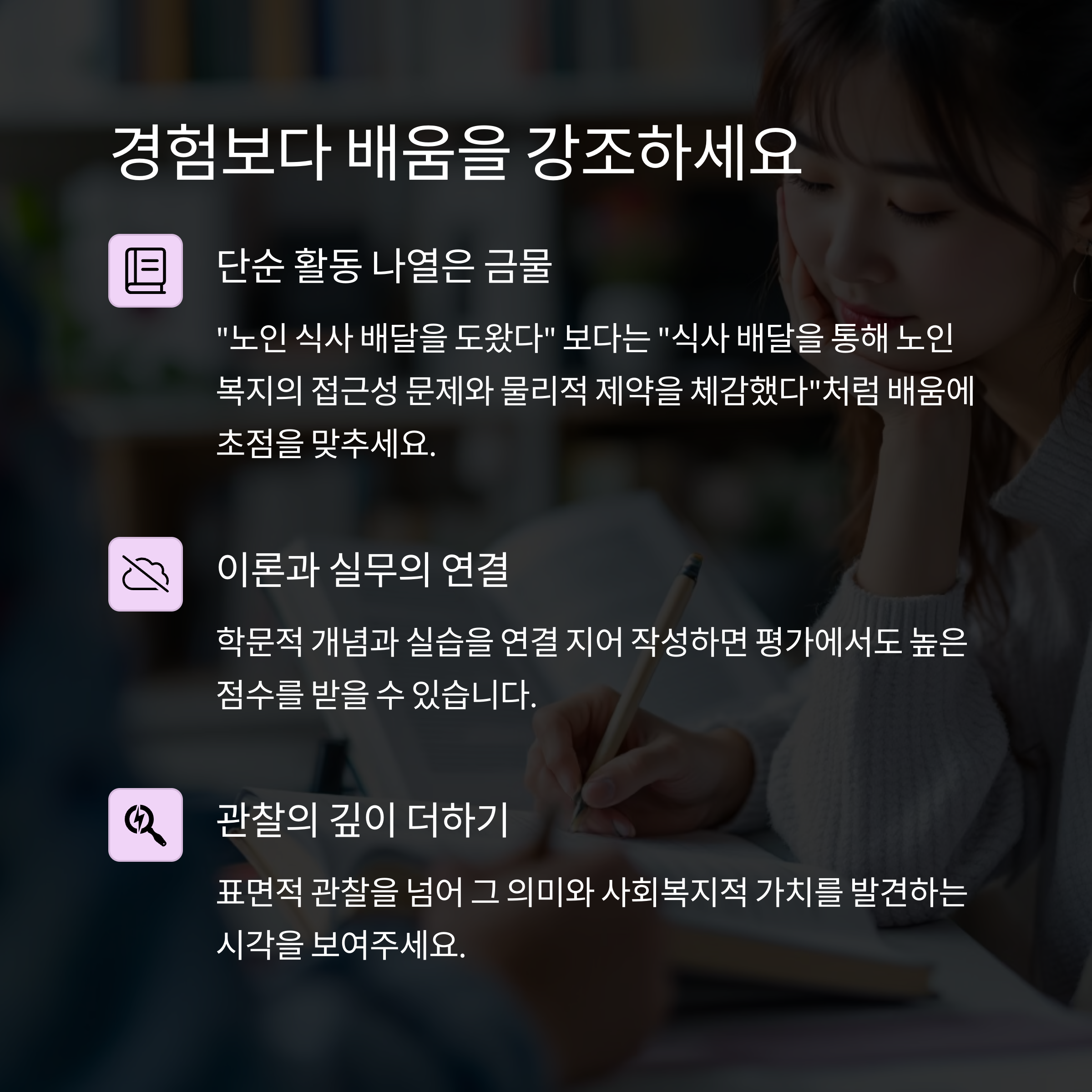 "어떤 일을 했는가"보다 **"그 일을 통해 무엇을 느끼고, 어떤 배움을 얻었는가"**가 핵심입니다.
