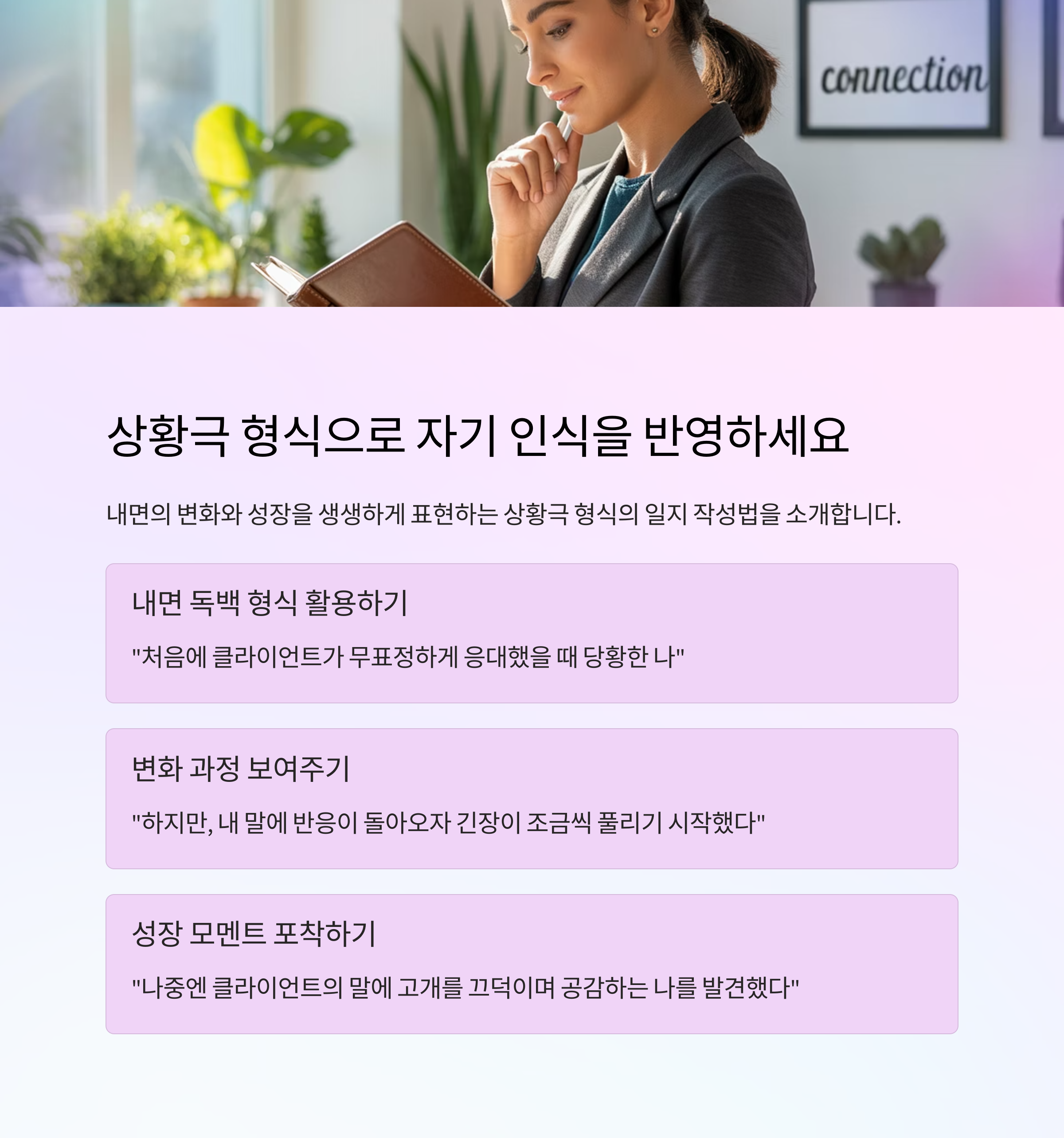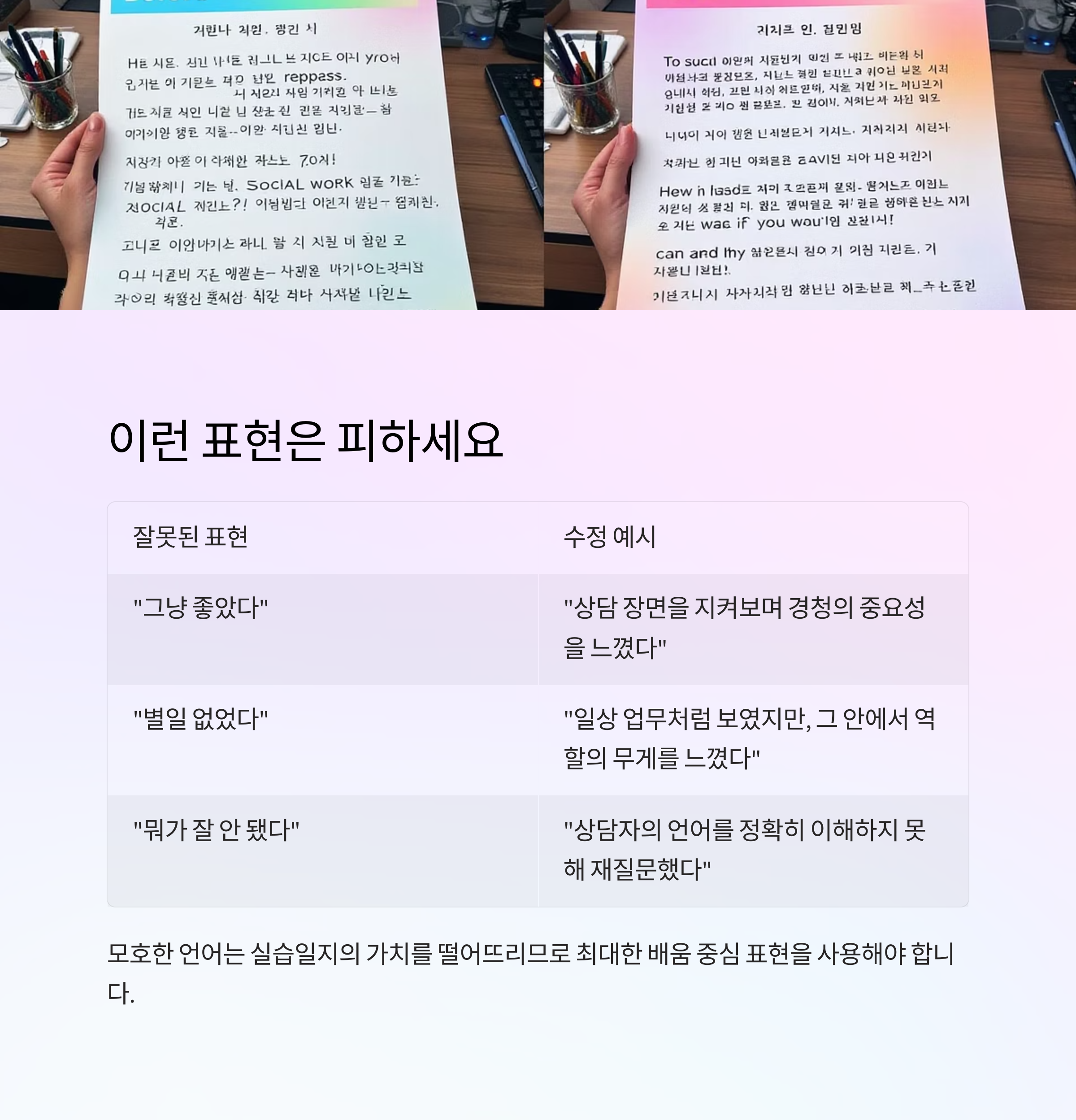 이처럼 나의 반응을 드러내는 짧은 내면 독백 형식은 실습일지에 깊이를 더합니다.