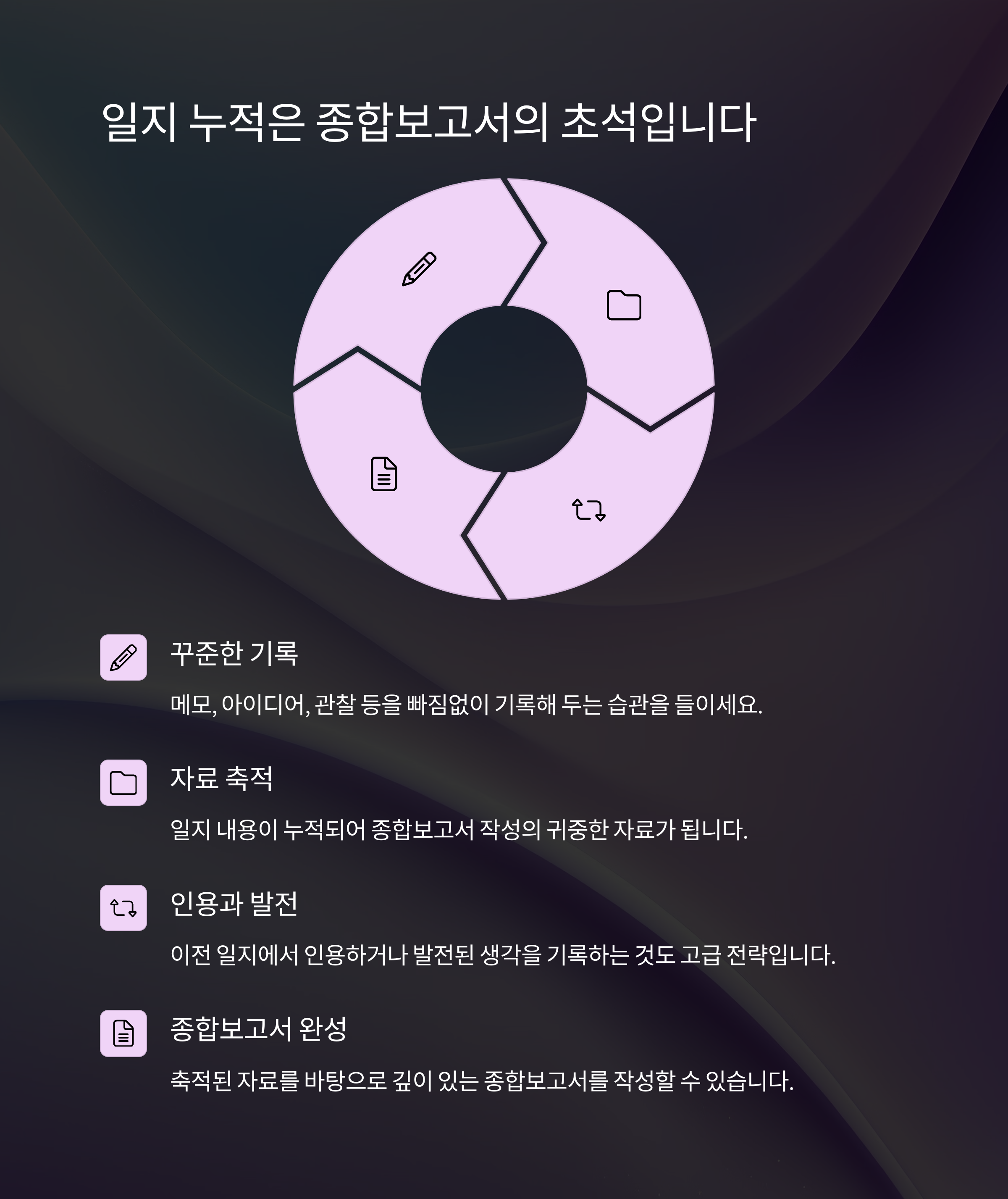 이전 일지에서 인용하거나 발전된 생각을 기록하는 것도 고급 전략입니다.