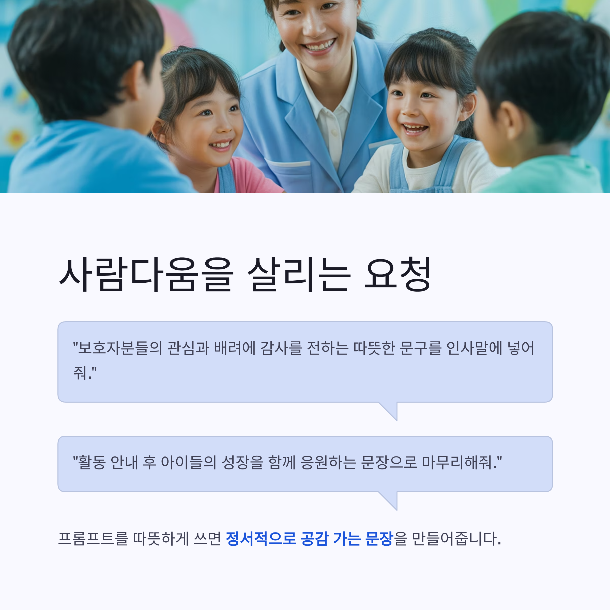 **프롬프트(요청문장)**를 사람이 따뜻하게 쓰면 그만큼 정서적으로 공감 가는 문장을 만들어줍니다.