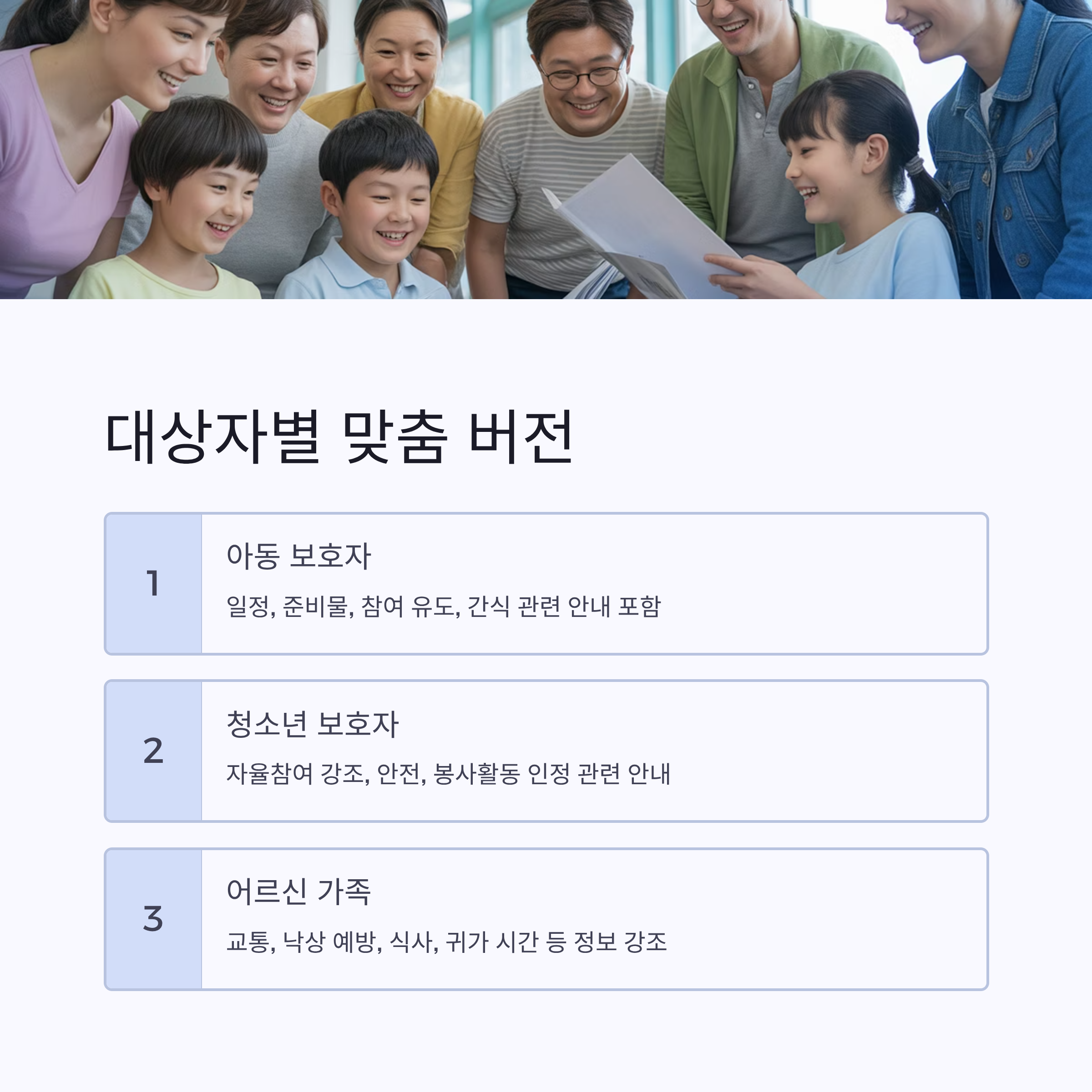| 어르신 가족 | 교통, 낙상 예방, 식사, 귀가 시간 등 정보 강조 |