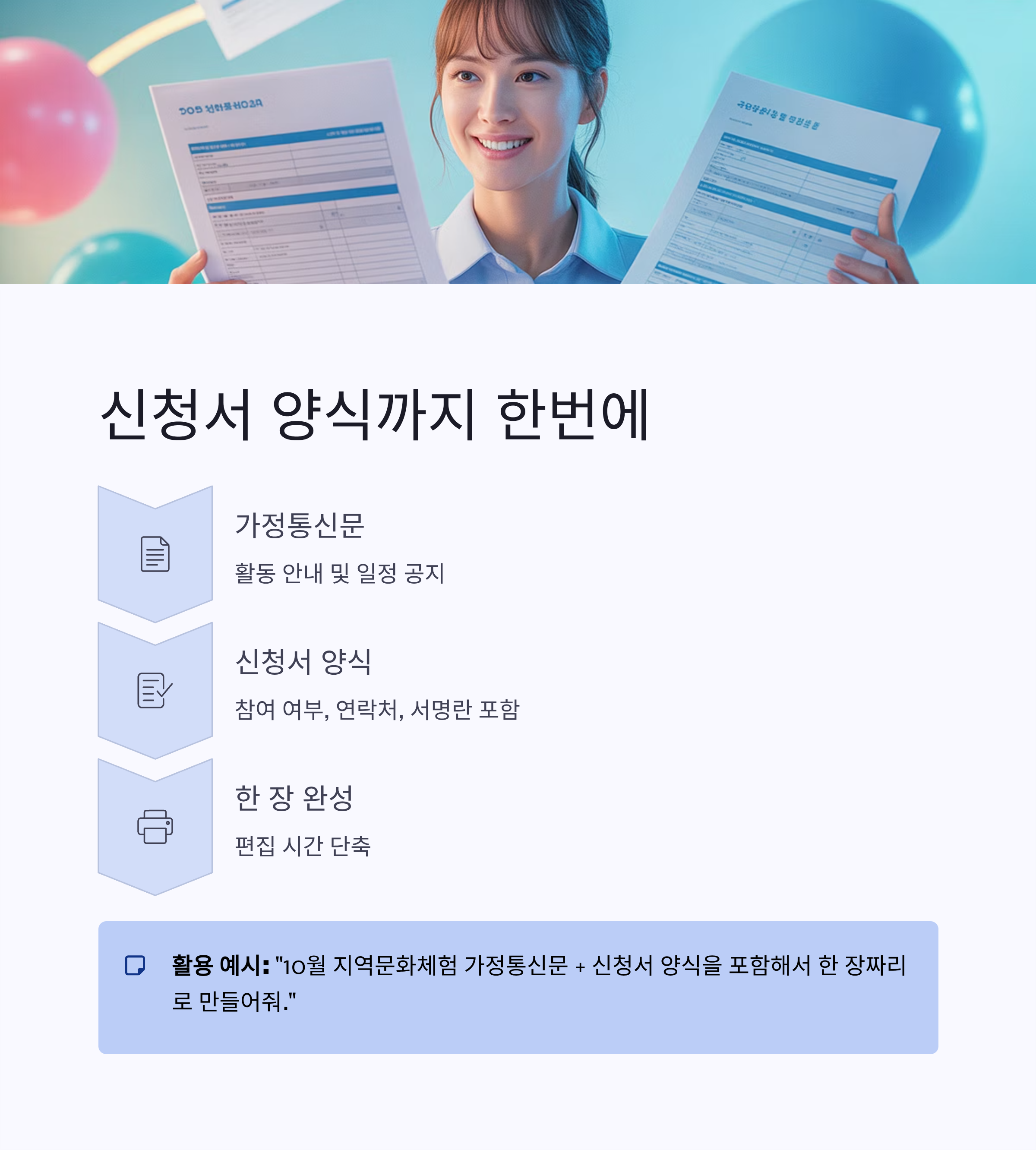 → “10월 지역문화체험 가정통신문 + 신청서 양식을 포함해서 한 장짜리로 만들어줘.”