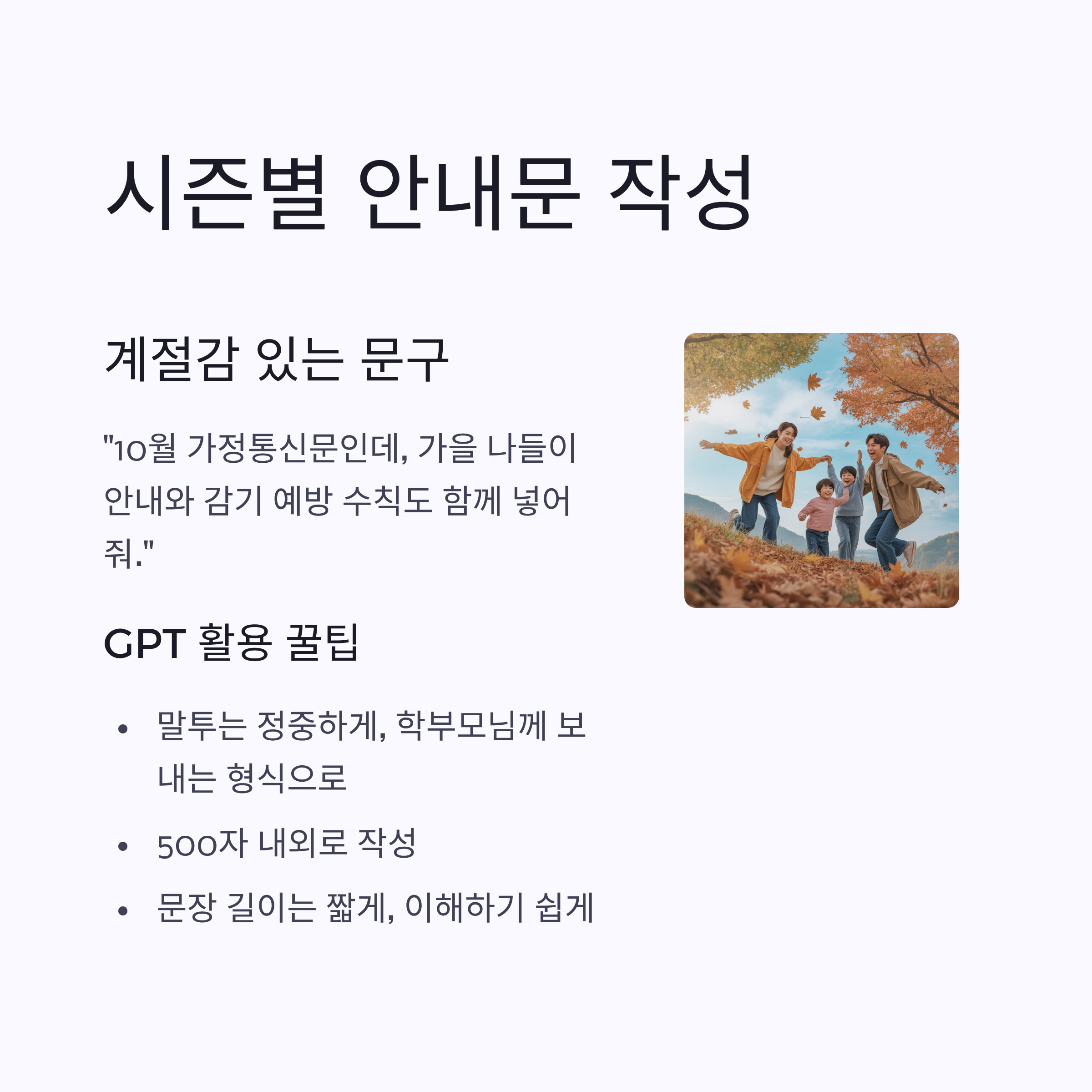 → “말투는 정중하게, 학부모님께 보내는 형식으로, 500자 내외로 작성해 줘.”