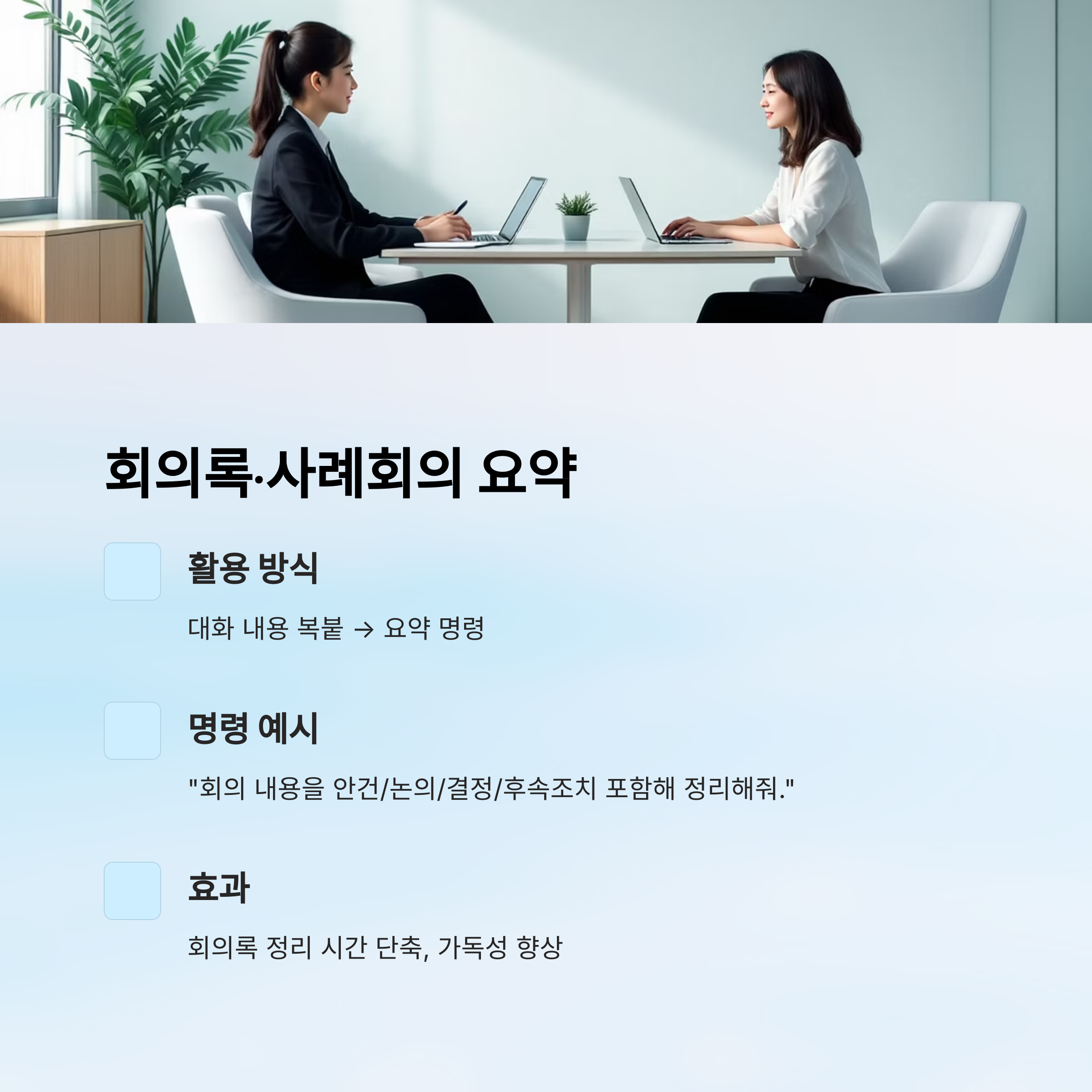 • 안건, 결정사항, 후속조치 정리 자동화