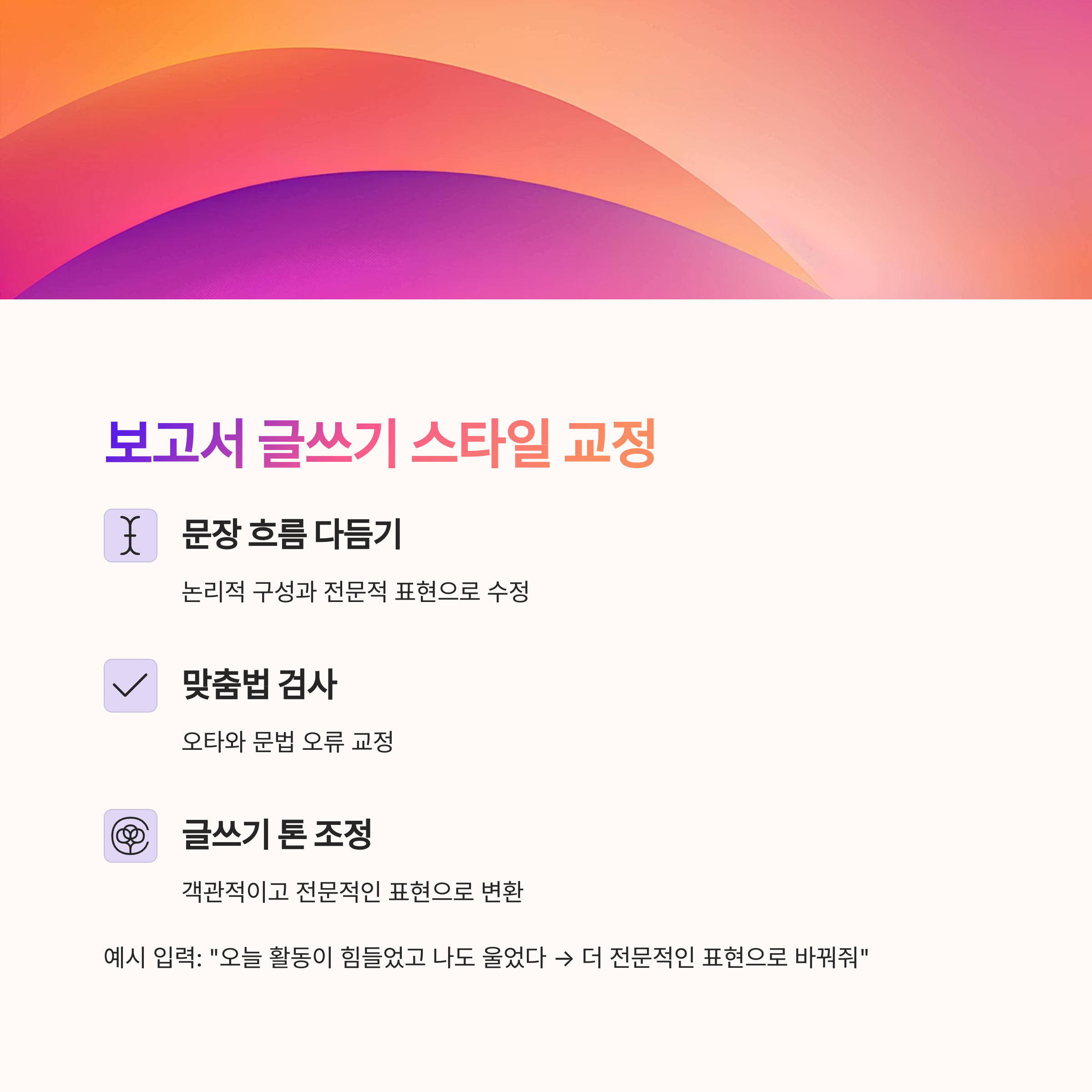 단순 교정 외에도, "좀 더 객관적인 문장으로 바꿔줘", "지나치게 감정적이야, 수정해 줘" 등의 요청에