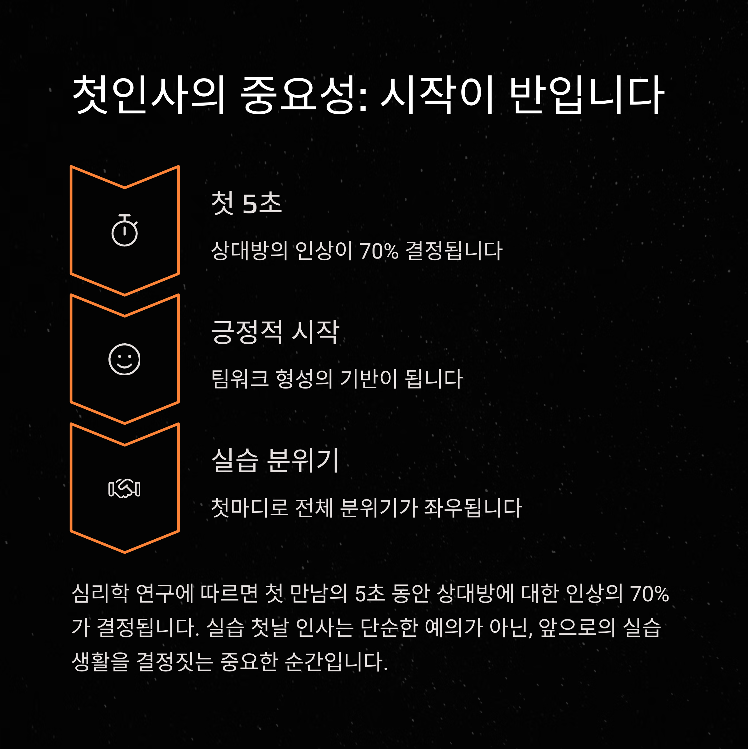 처음 만나는 자리에서는 이름과 소속, 실습 목적을 분명히 밝히는 것이 예의입니다.
