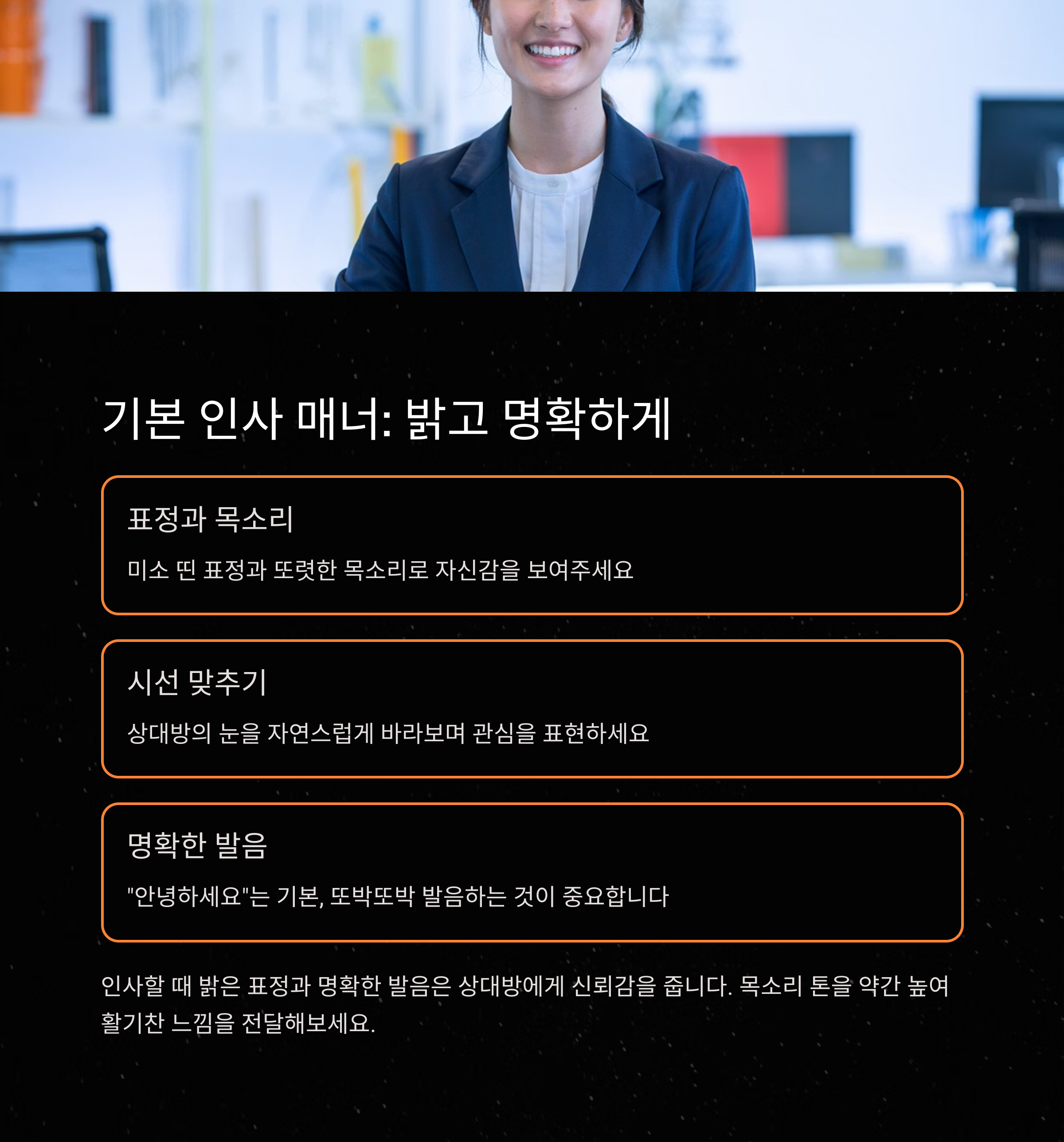 인사 후에도 밝은 표정과 적극적인 태도를 유지하세요.