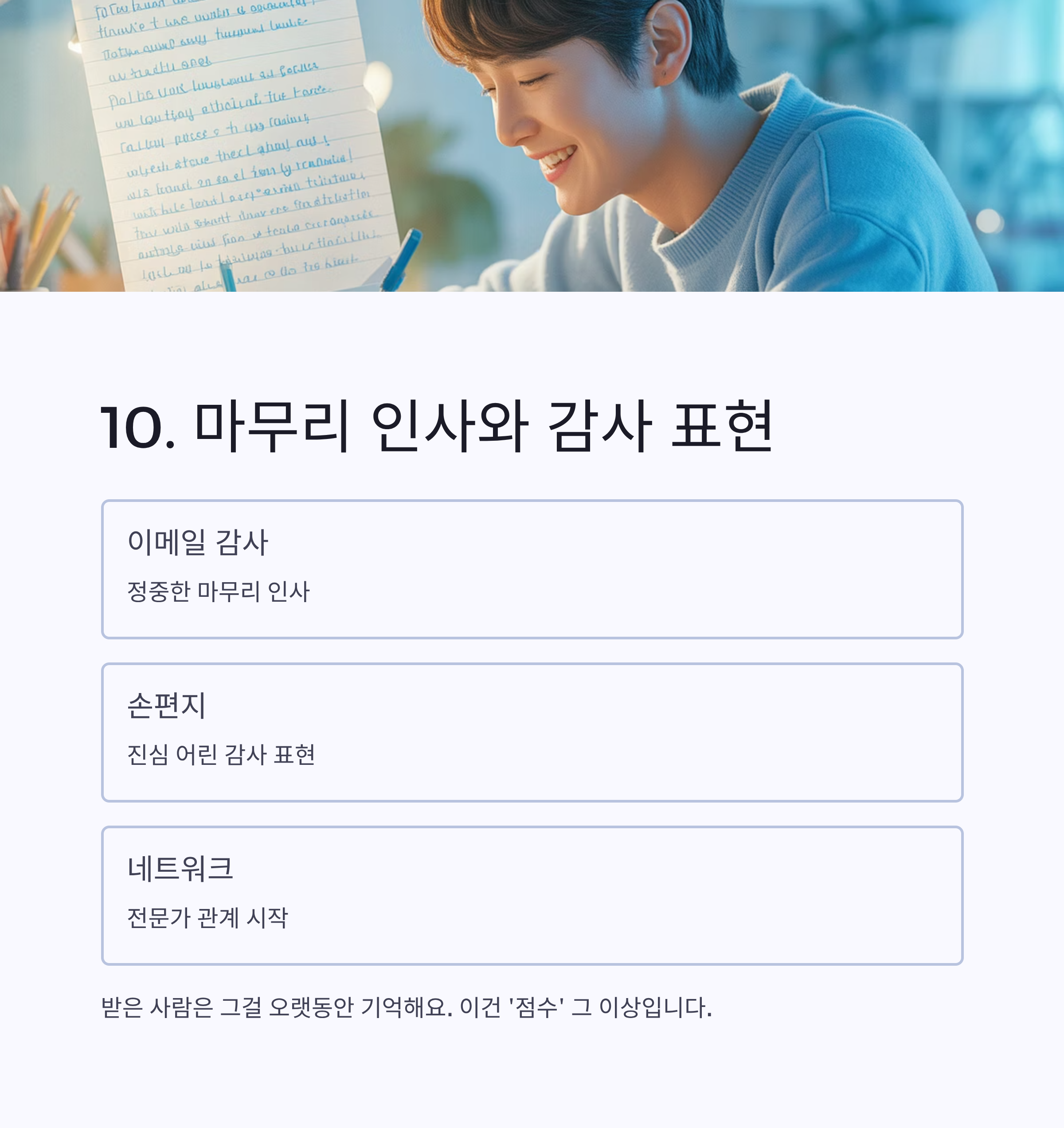 | 10 | 진심 어린 감사 표현으로 마무리 짓기 |