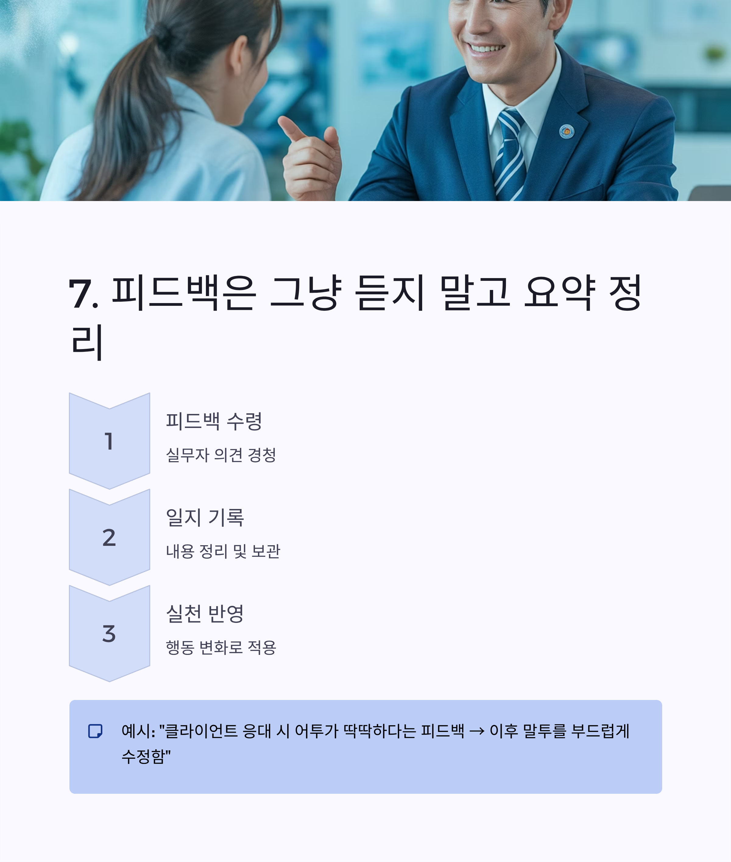 “클라이언트 응대 시 어투가 딱딱하다는 피드백 → 이후 말투를 부드럽게 수정함”