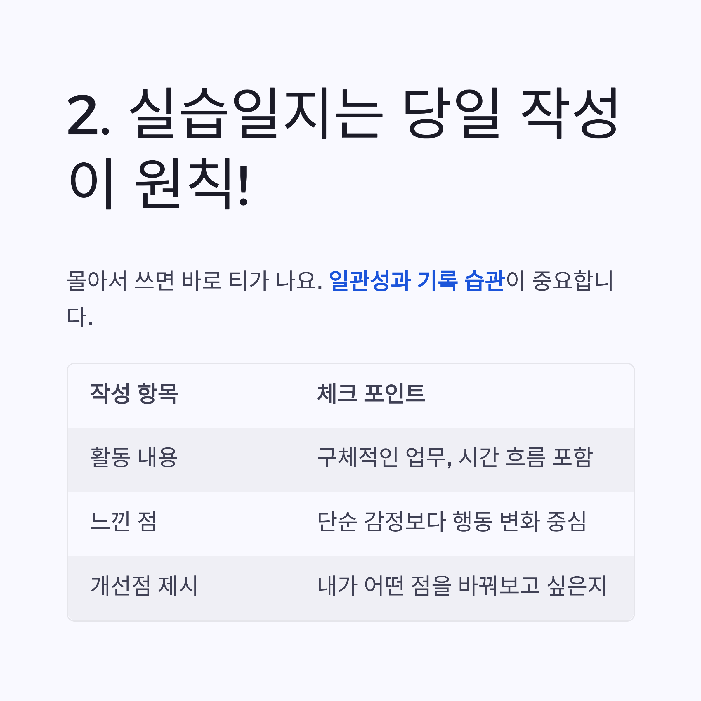 | 개선점 제시 | 내가 어떤 점을 바꿔보고 싶은지 등 |