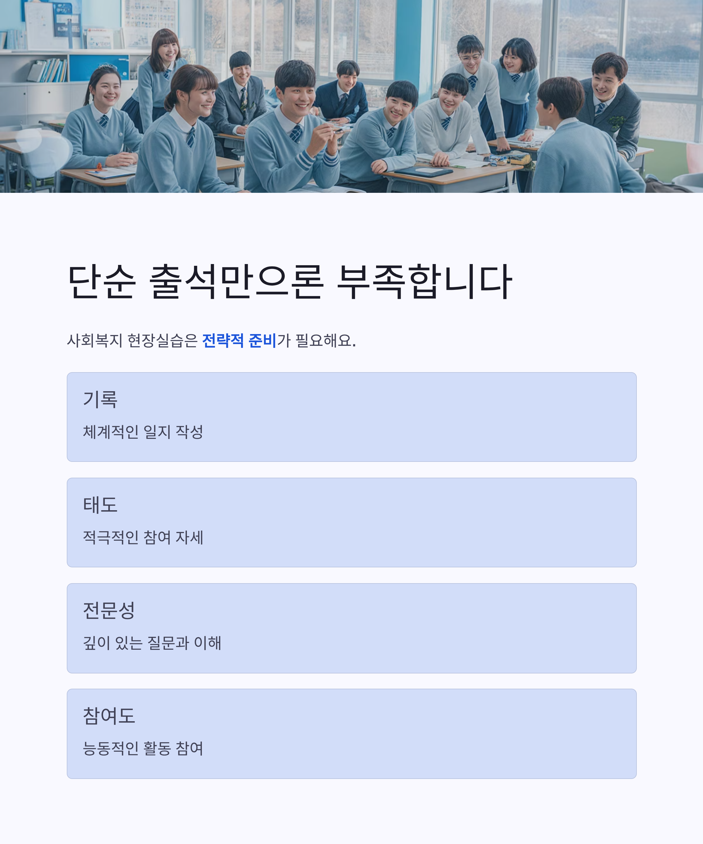 이 글에서는 사회복지 실습에서 실제로 고득점을 받은 학생들이 공통적으로 실천한 10가지 전략을 핵심만 쏙쏙 모아 알려드릴게요!