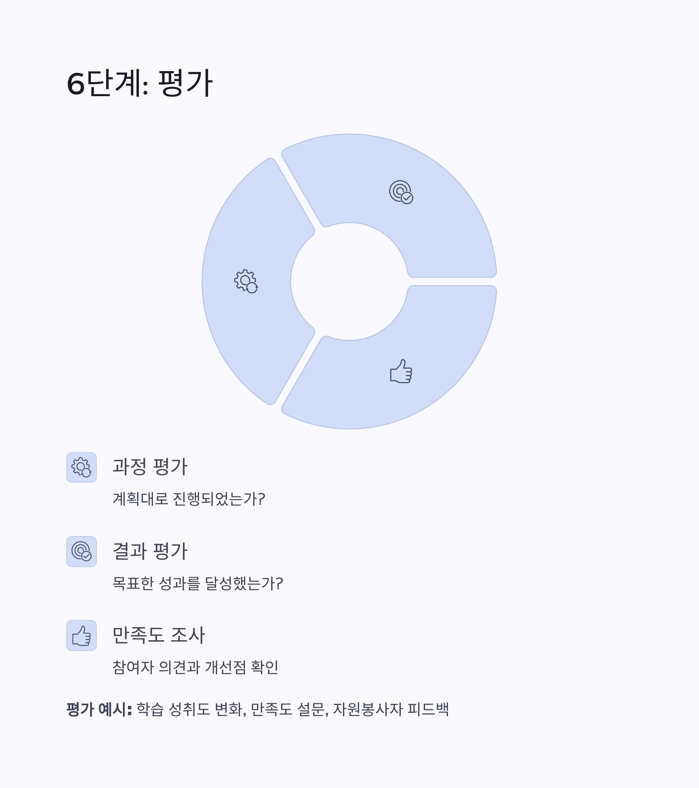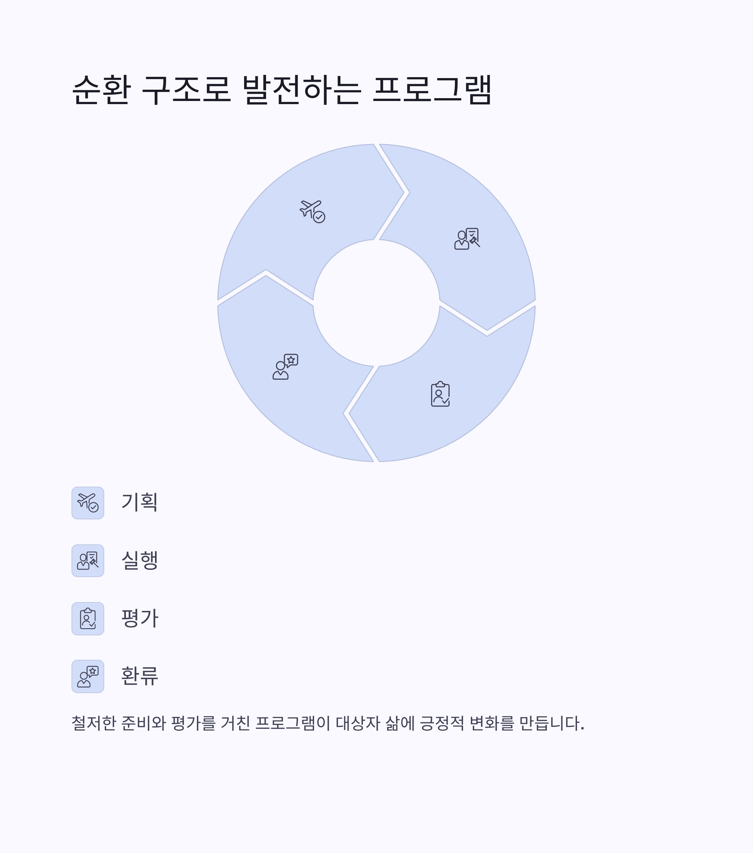 기획 → 실행 → 평가 → 환류 과정을 반복하며 점점 더 완성도 높은 프로그램으로 발전시켜야 합니다.