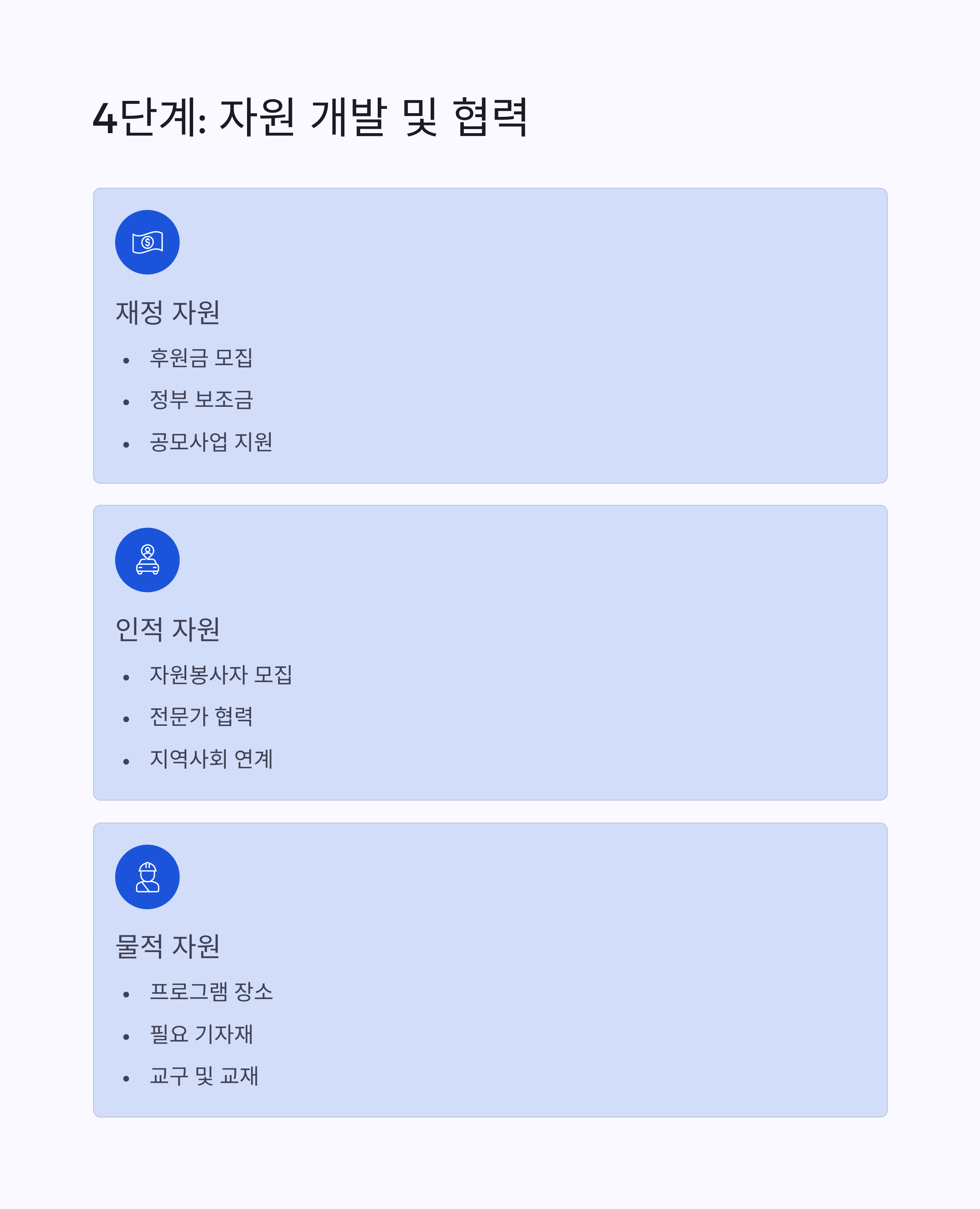 - 재정 자원: 후원, 보조금, 공모사업 지원