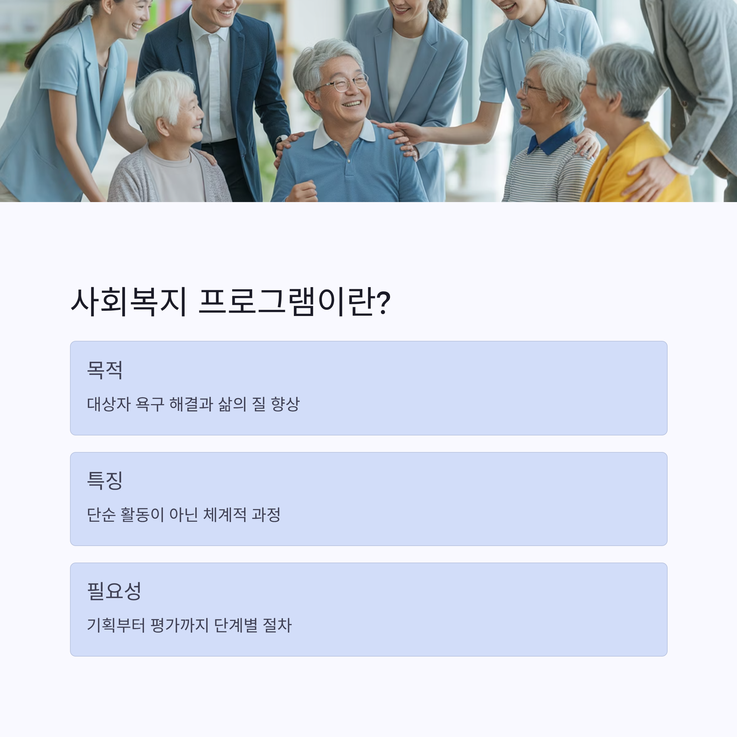 사회복지 프로그램은 단순한 행사나 활동이 아니라 대상자의 욕구를 해결하고 삶의 질을 높이는 과정입니다. 그래서 기획부터 실행, 사후 평가까지 단계별로 체계적인 절차가 필요합니다. 이번 글에서는 사회복지 프로그램이 어떤 과정을 거쳐 완성되는지 전 과정을 정리해 드리겠습니다.