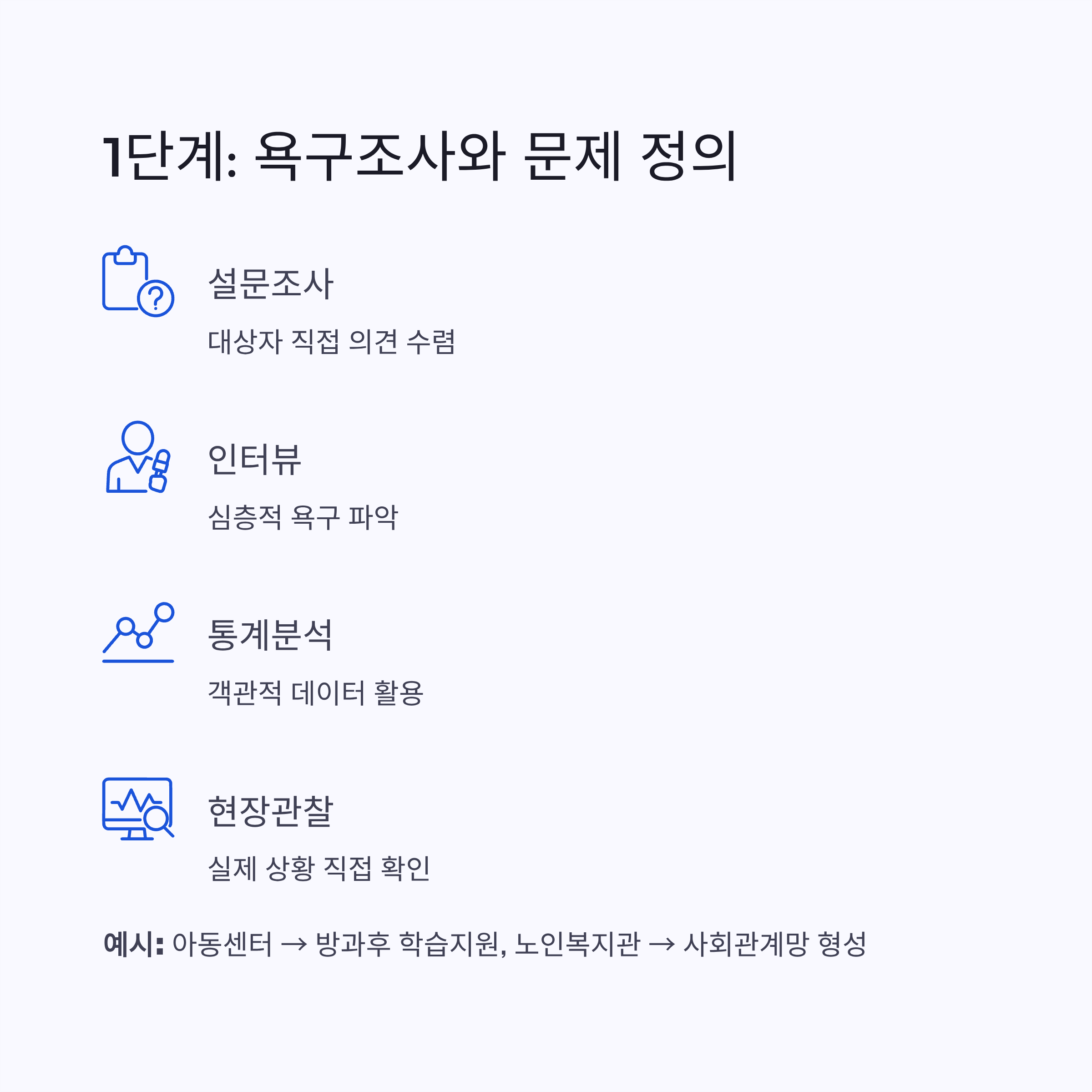 설문조사, 인터뷰, 통계자료 분석, 현장 관찰 등을 통해 실제로 필요한 부분이 무엇인지 확인해야 합니다.