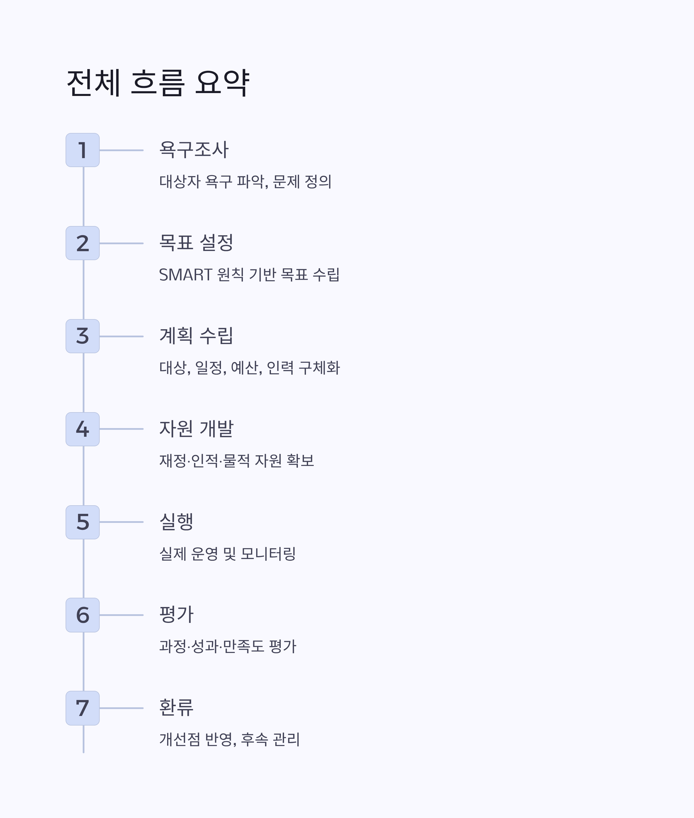 | 계획 수립 | 대상, 일정, 예산, 인력 등 구체화 |
