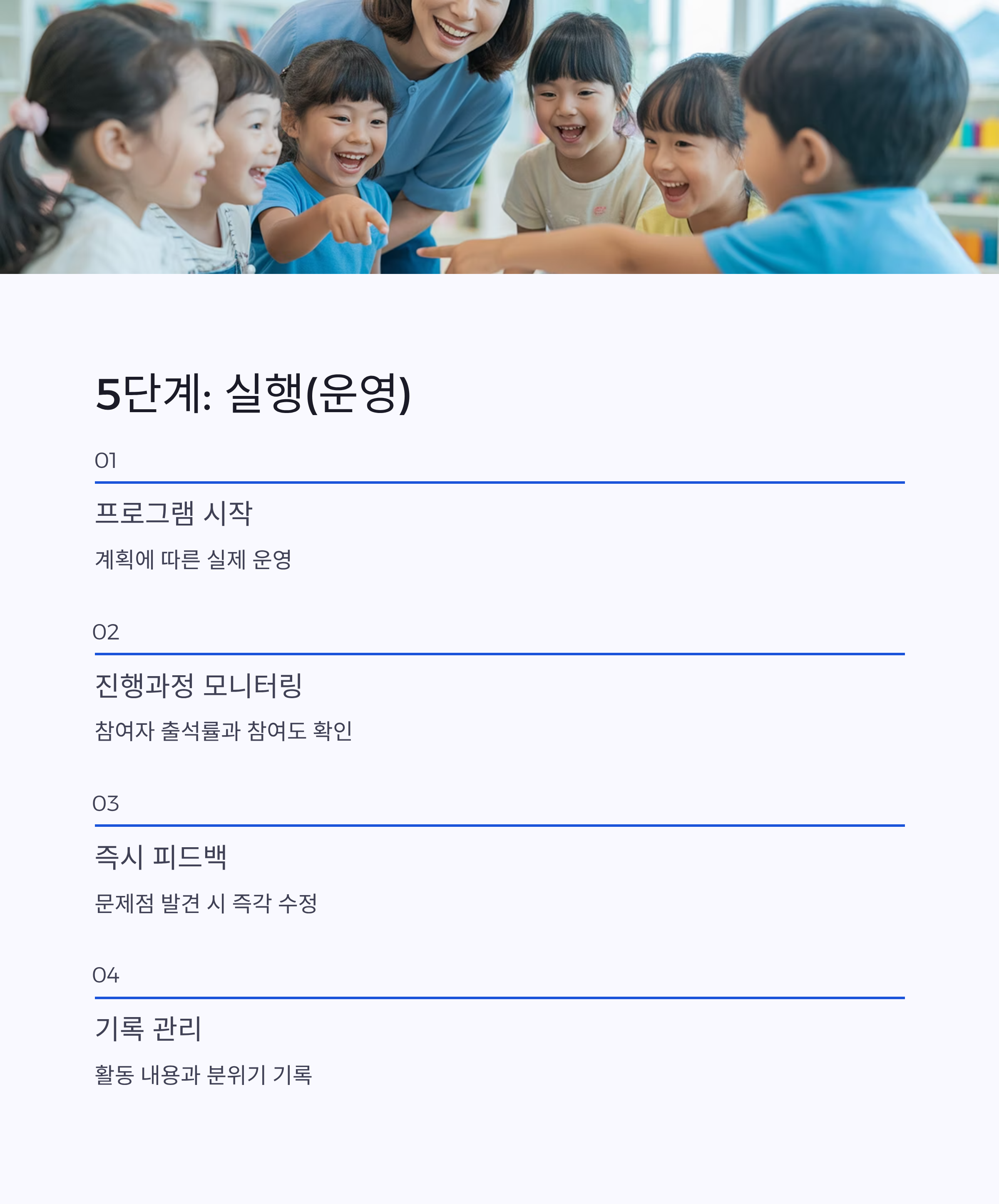 기획 → 실행 → 평가 → 환류 과정을 반복하며 점점 더 완성도 높은 프로그램으로 발전시켜야 합니다.