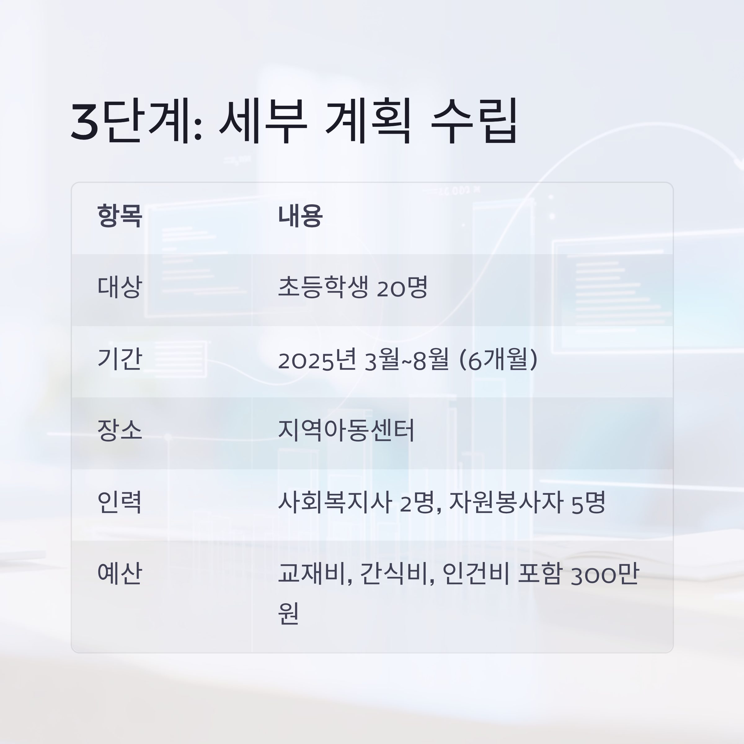 | 예산 | 교재비, 간식비, 인건비 포함 300만 원 |