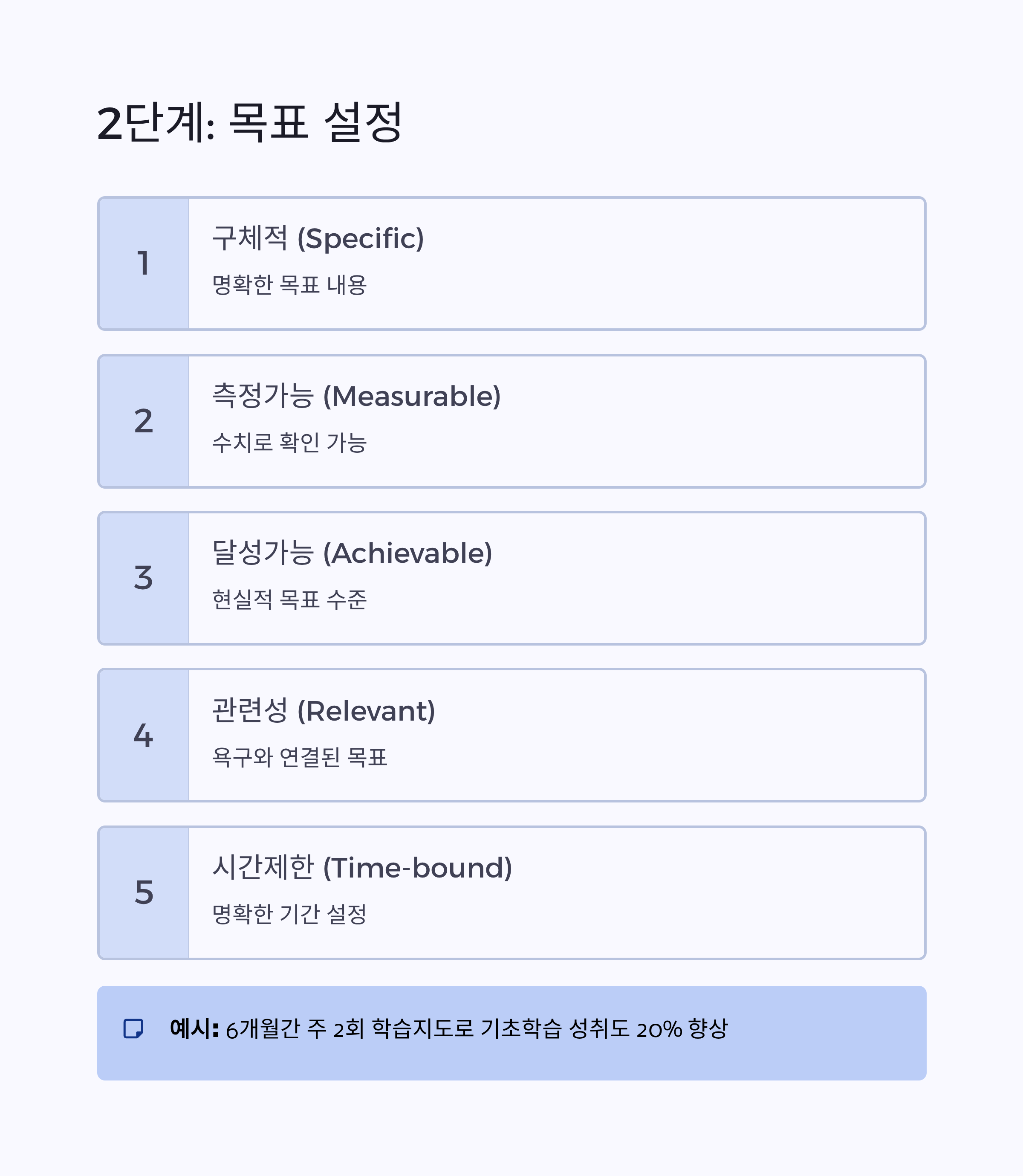 이때 목표는 SMART 원칙(구체적·측정 가능·달성 가능·현실적·시간제한)을 반영해야 합니다.