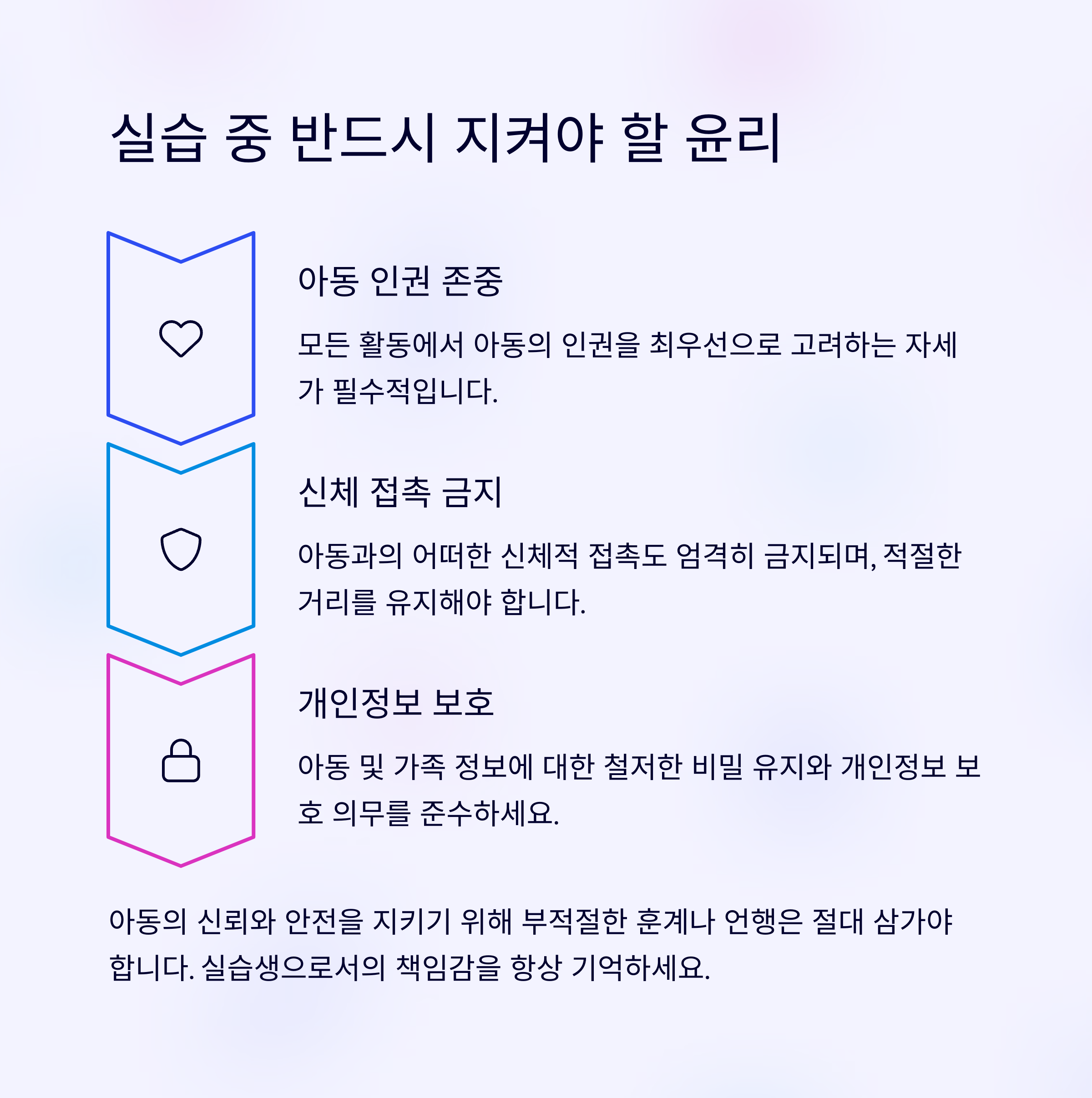 실습일지 작성은 매일 해야 하며, 시간대별 활동을 구체적으로 기록하는 것이 중요합니다. 진행 과정, 느낀 점, 지도자의 피드백까지 모두 포함되어야 하며, 이는 실습 종료 후 보고서 작성에도 큰 도움이 됩니다. 또한 실습 중 아동과의 직접적인 접촉, 훈계, 사적인 연락 등은 엄격히 금지되어 있으며, 이는 실습의 윤리 기준을 지키기 위한 필수 항목입니다.