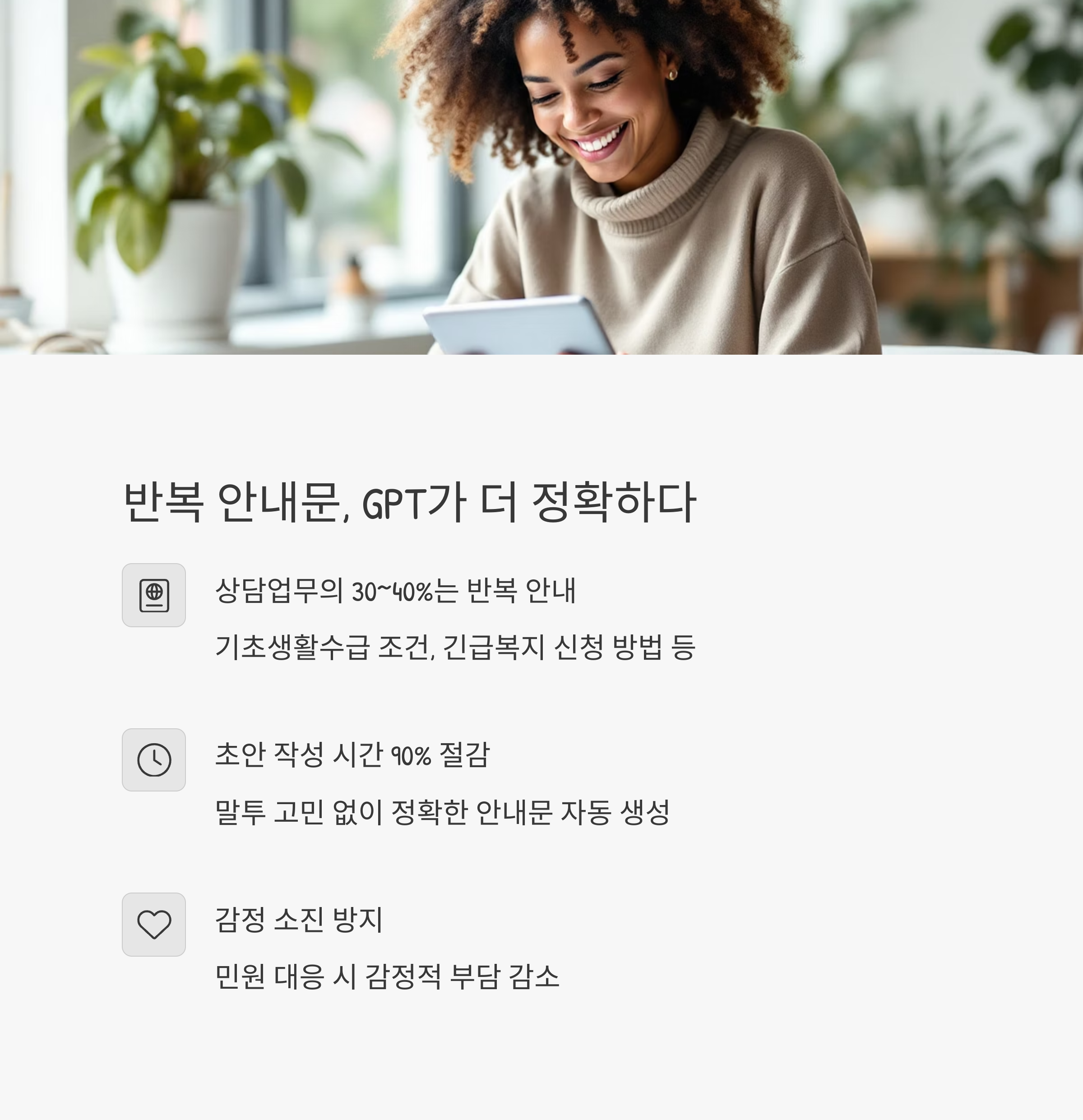 지금부터 상담업무에서 GPT가 자동화 도구로 실제 활용 가능한 이유를 구체적으로 살펴봅니다.