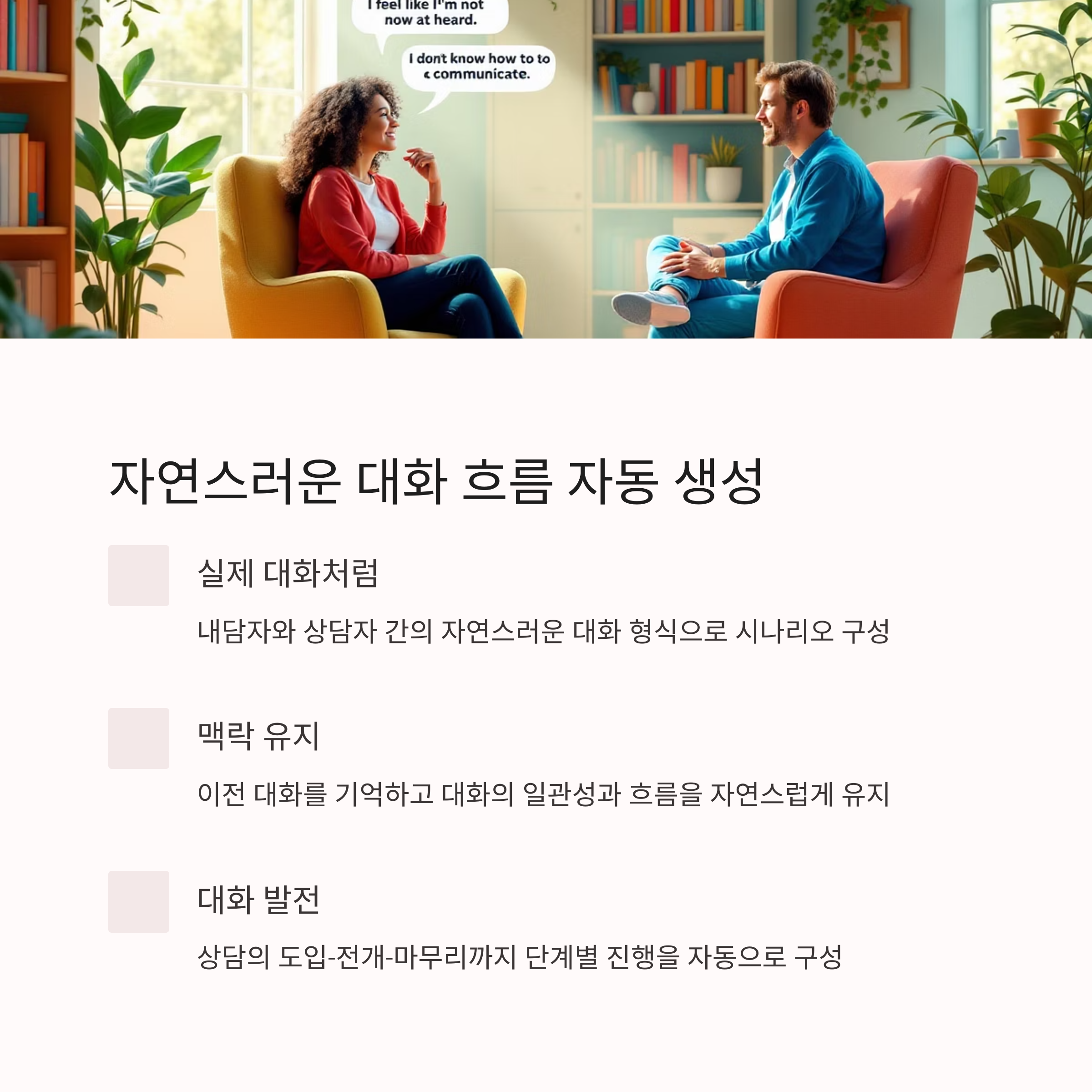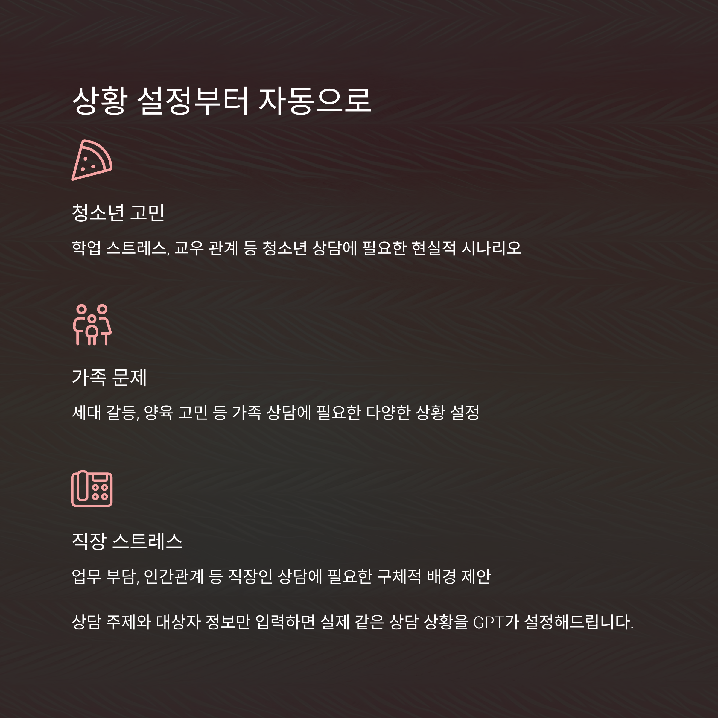 상담자와 내담자의 대화 형식으로 시나리오를 자동으로 구성합니다.