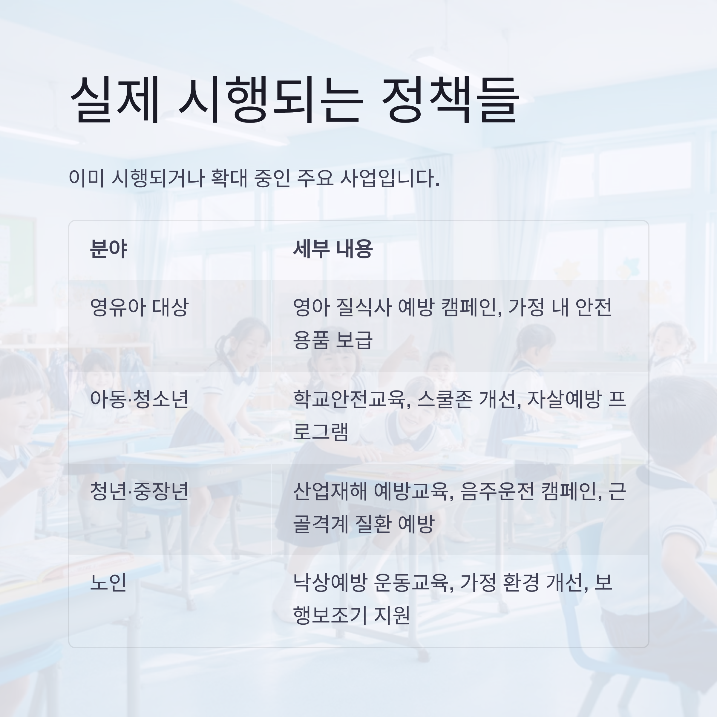 | 아동·청소년 손상 예방 | 학교안전교육, 스쿨존 개선, 자살예방 프로그램 운영 등 |