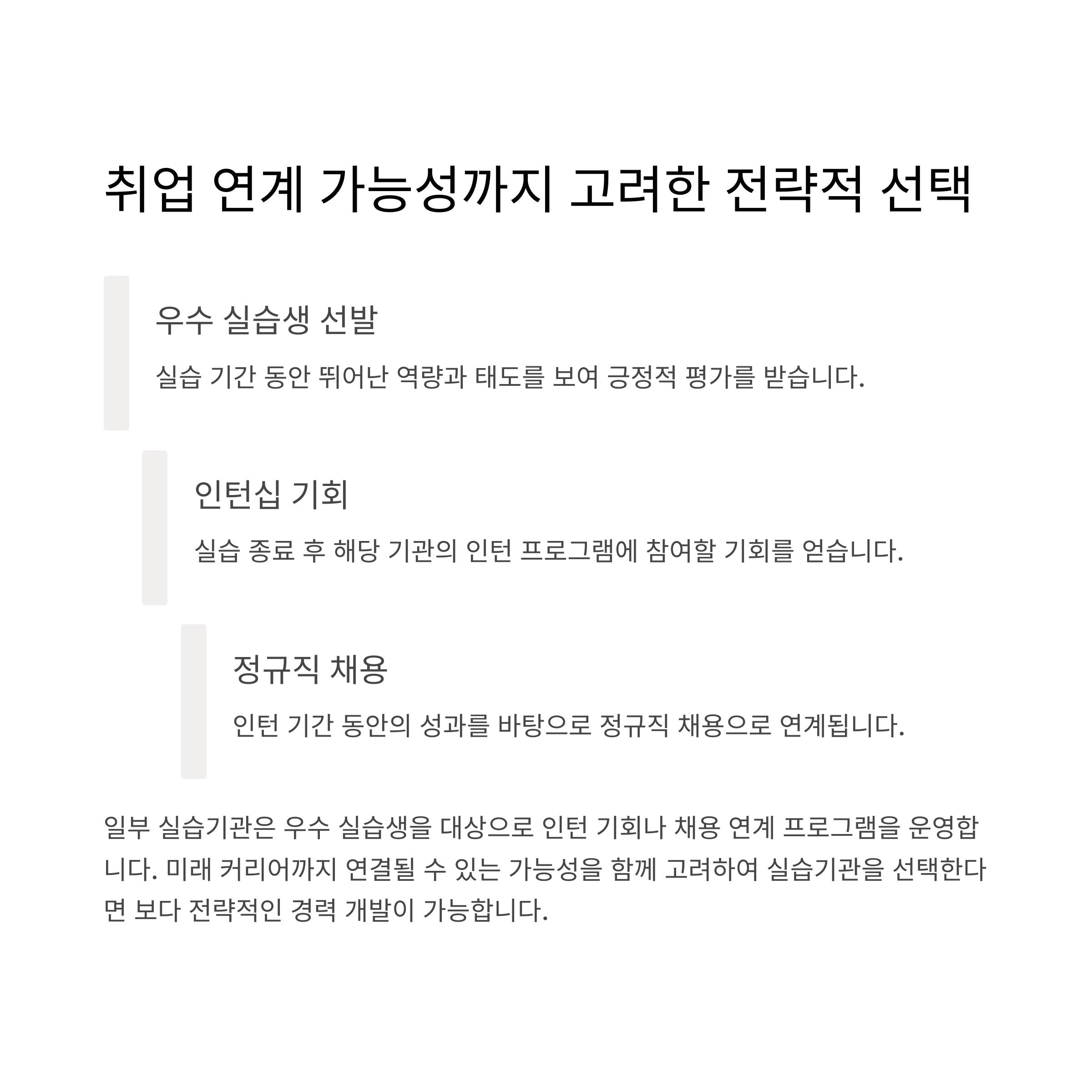 일부 실습기관은 우수 실습생을 대상으로 인턴 기회나 채용 연계 프로그램을 운영하기도 합니다.
