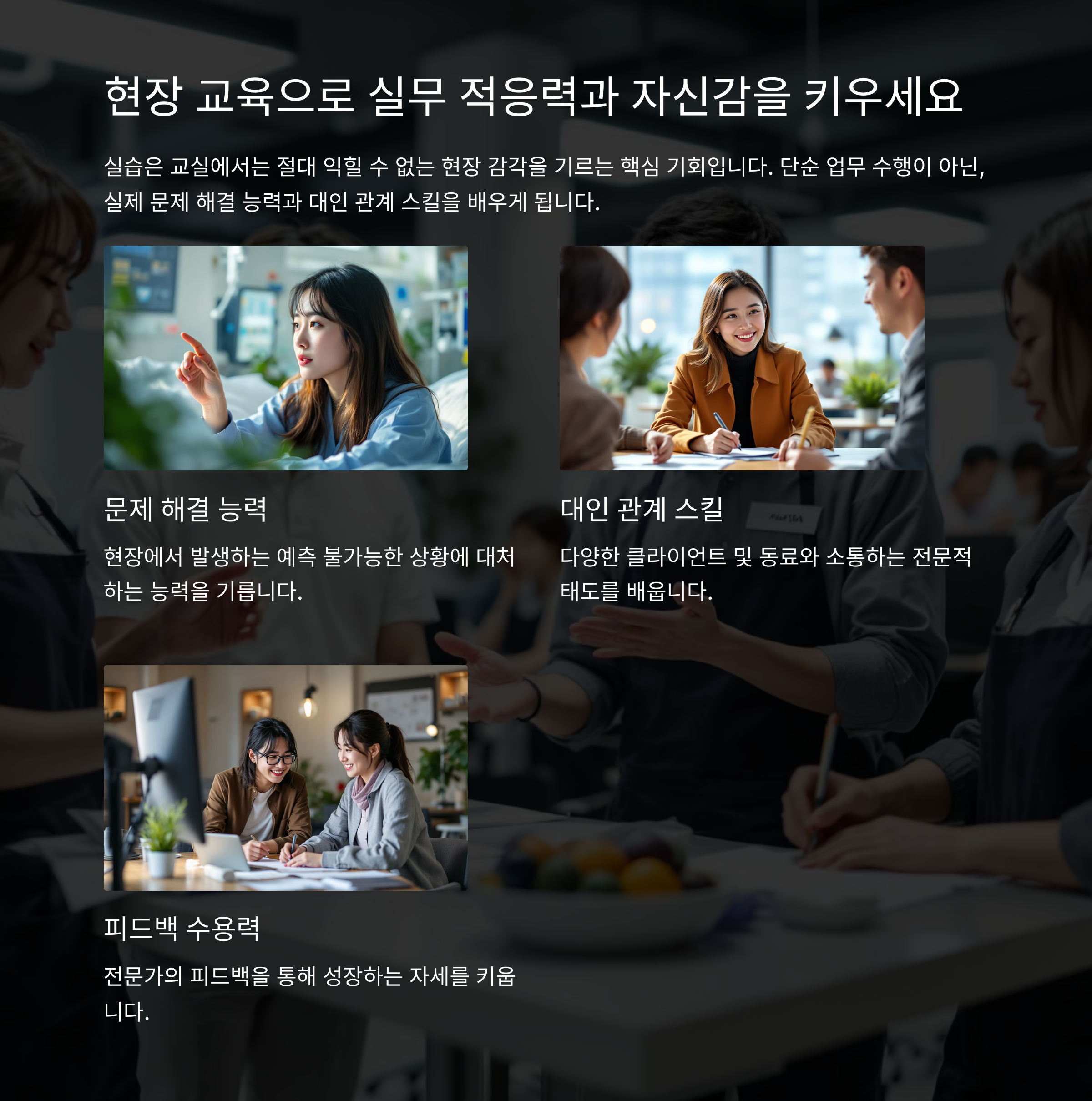 단순히 업무를 수행하는 것이 아니라, 현장에서의 문제 해결 능력, 대인 관계 스킬 등을 배우게 됩니다.