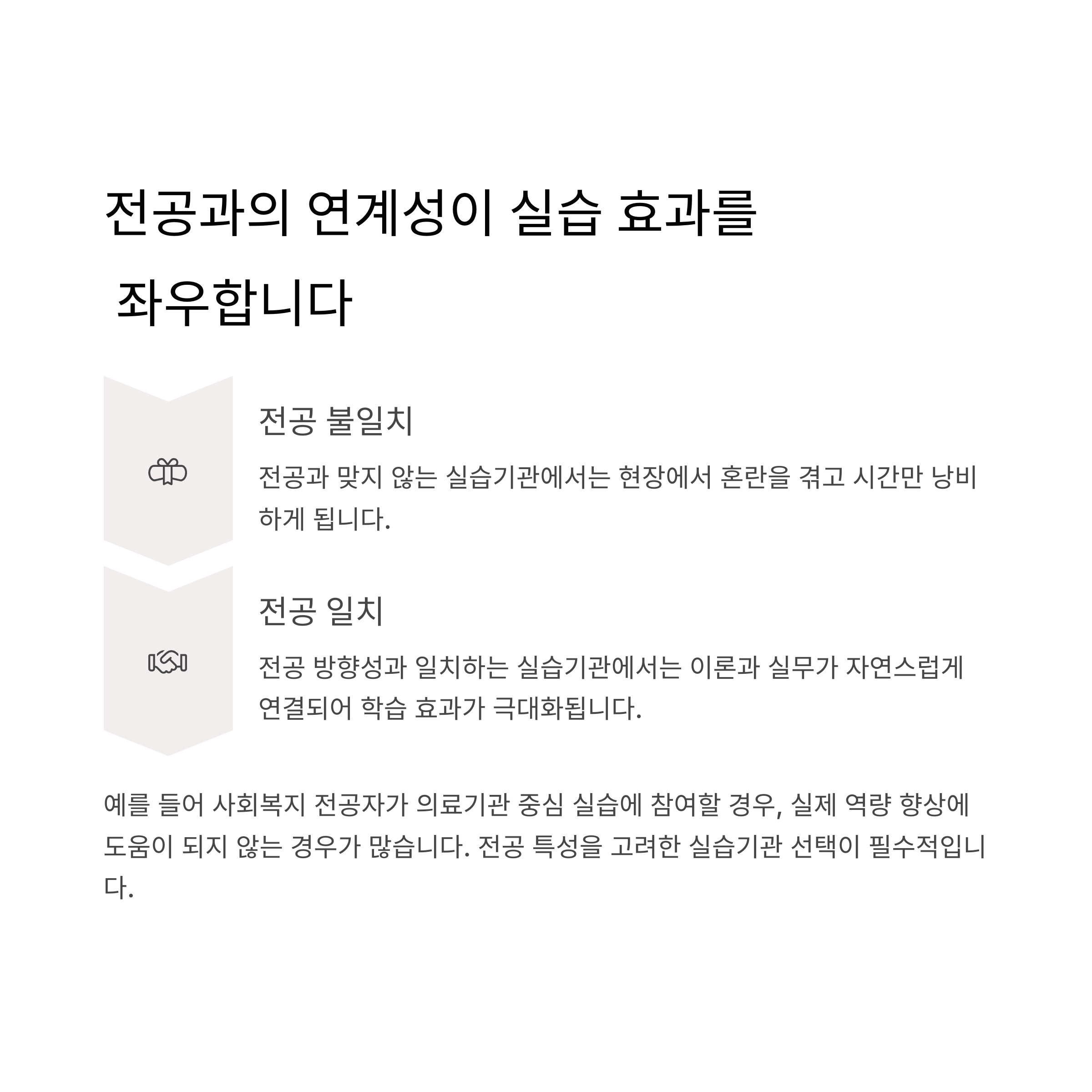 예를 들어 사회복지 전공자가 의료기관 중심 실습에 참여할 경우, 현장에서 느끼는 혼란이 커질 수 있고, 실제 역량 향상에도 도움이 되지 않는 경우가 많습니다.