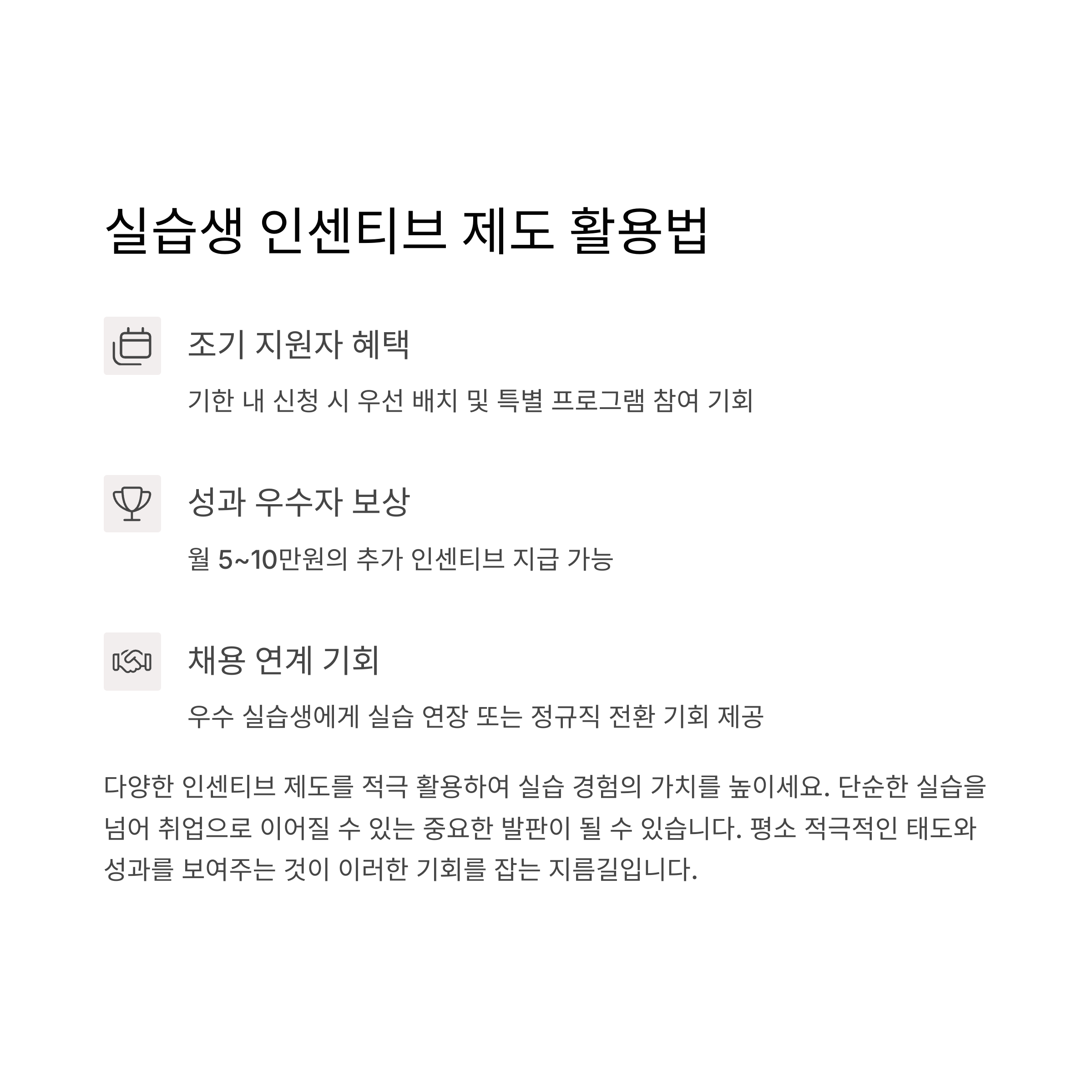 일부 기관에서는 조기 지원자, 성과 우수자를 대상으로 실습연장, 채용연계, 추가 인센티브를 제공합니다. 예를 들어 최대 월 5~10만 원의 추가 지급이 적용될 수 있습니다. 이러한 제도를 잘 활용하면 실습경험을 넘어 취업 기회까지 연결할 수 있습니다.