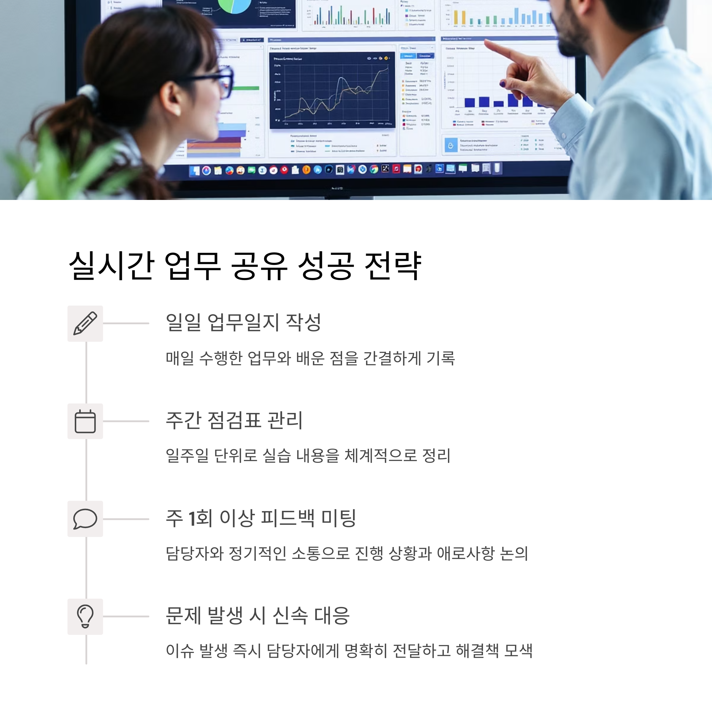 실습 기간 동안은 매일 업무일지를 작성하고 주간 점검표를 통해 실습 내용을 상시 공유합니다. 기관 담당자와는 주 1회 이상 피드백 미팅 또는 메시지 교환을 통해 실습 진행 상황과 애로사항을 적극 논의해야 합니다. 이렇게 하면 문제 발생 시 신속히 대응할 수 있습니다.