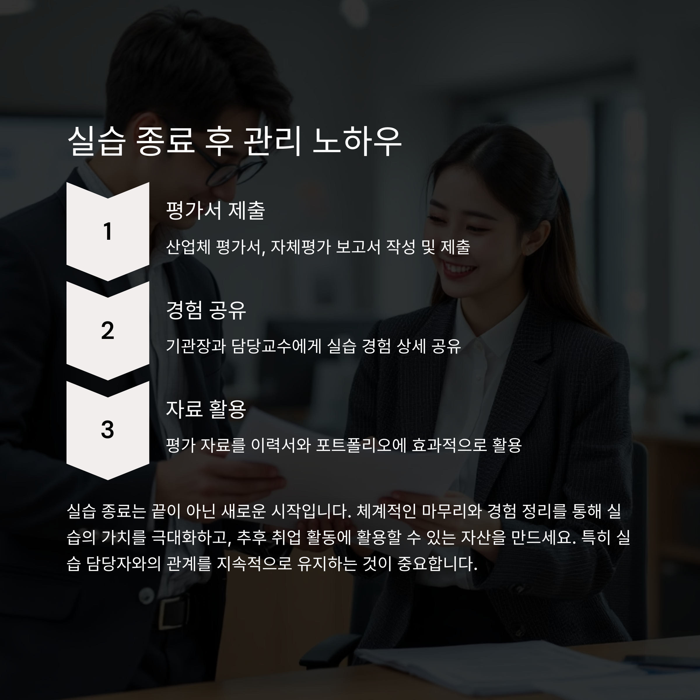 실습 종료 즉시 산업체 평가서, 자체평가 보고서를 작성하여 제출합니다. 기관장과 담당교수에게 실습경험을 상세히 공유하면 차후 취업추천서 작성에도 도움이 됩니다. 평가 자료는 추후 본인 이력서나 포트폴리오에도 활용 가능합니다.