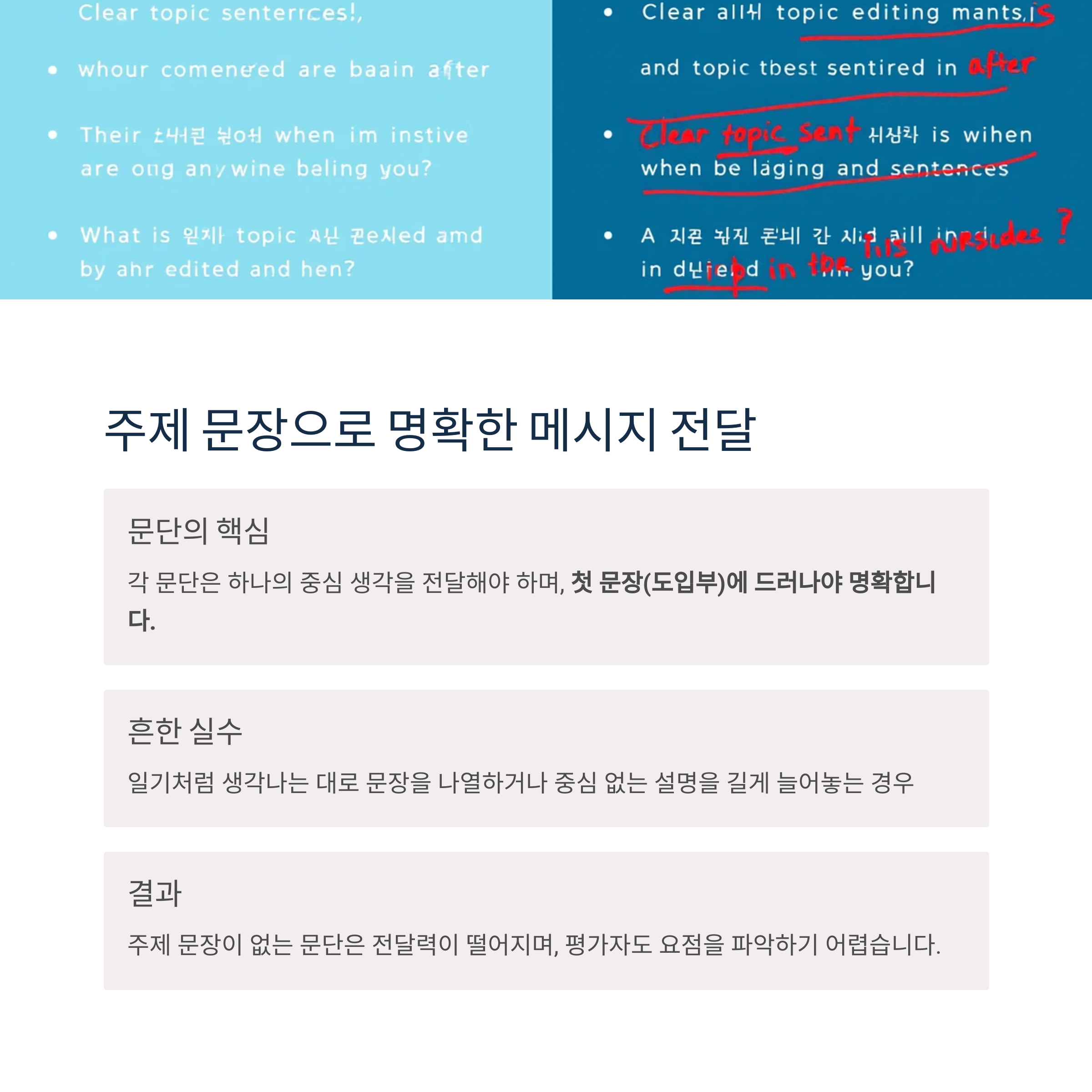 주제 문장이 없는 문단은 전달력이 떨어지며, 평가자도 요점을 파악하기 어렵습니다.