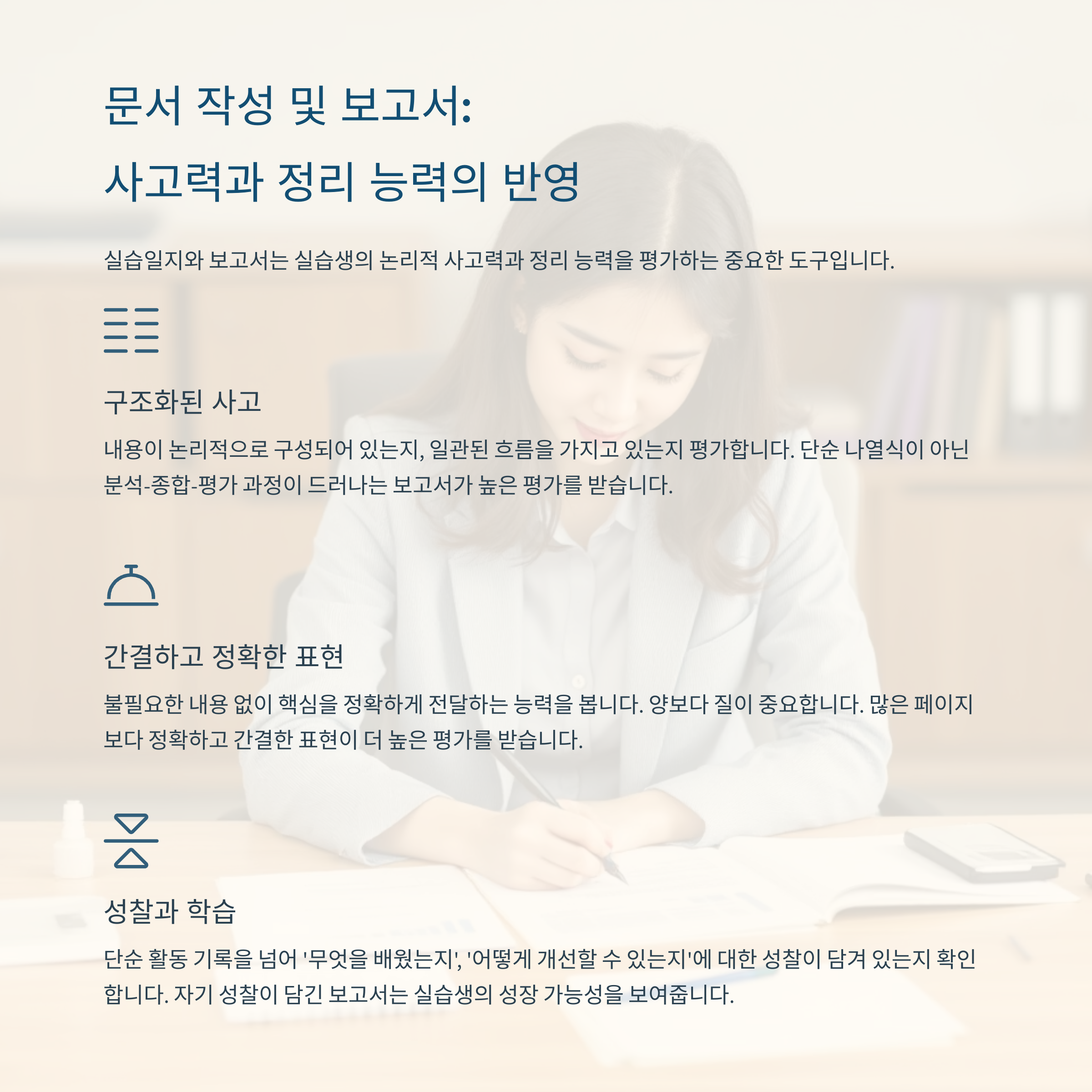 문서 작성 정리 능력, 표현력 일지·보고서의 구성력, 내용 충실도