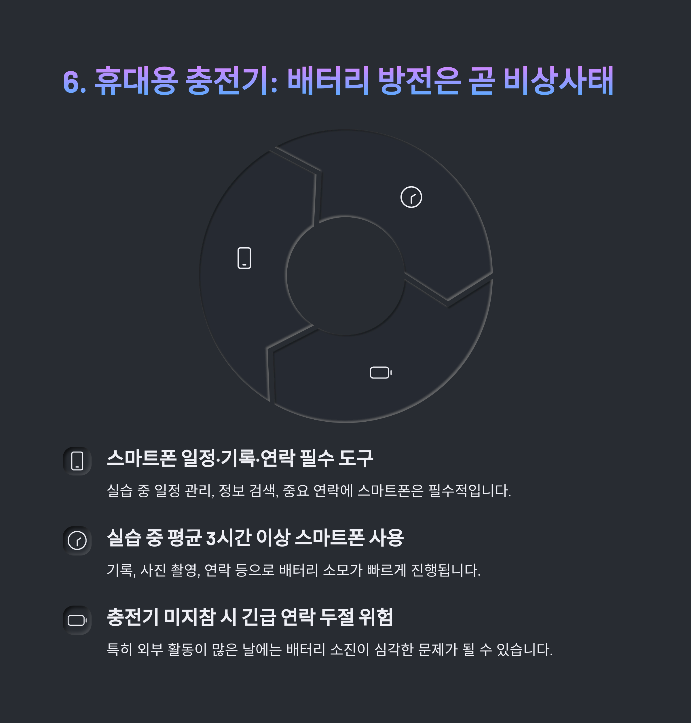 배터리가 방전되면 업무에 차질이 생길 수 있으니 보조배터리를 꼭 챙기세요.